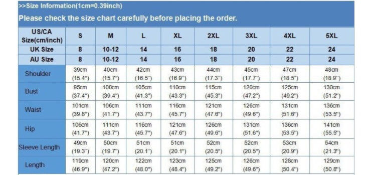 2. Please check the size chart carefully before you buy the item, if you don't know how to choose size, please contact our customer service.