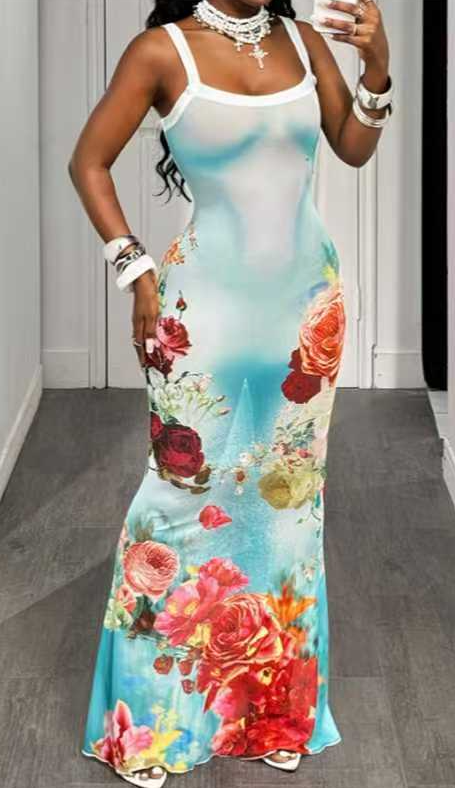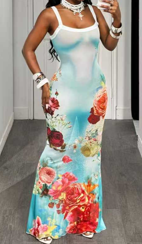 Style: Vacation/Casual / Mature & Sexy Neckline: Square Neck (Shower Strap Design) Sleeves: Sleeveless Fit: Slim-fit Mermaid Maxi Dress Suitable Seasons: Summer, Early Autumn Design: Contrasting trim on the dress straps and a slim-fit mermaid skirt create a romantic, retro look that flatters the figure. Suitable Occasions: Vacation, Beach Photos, Dating, Evening Outfits, Street Style, etc.