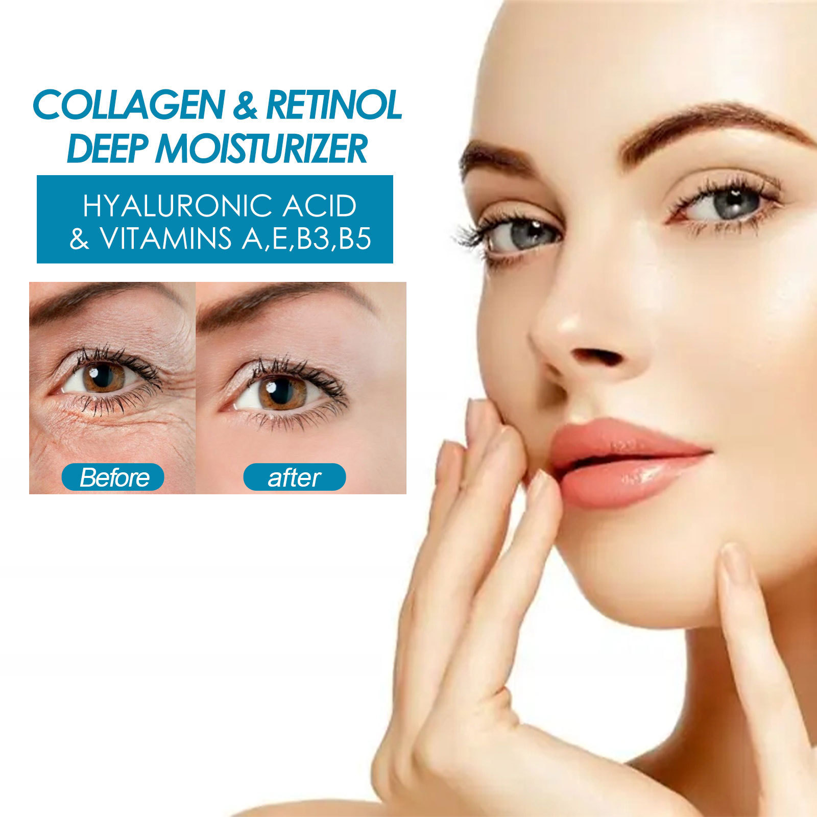 Product Ingredients: hydrolyzed marine collagen, retinol (vitamin A), vitamin E, hyaluronic acid, vitamin B5, vitamin B3