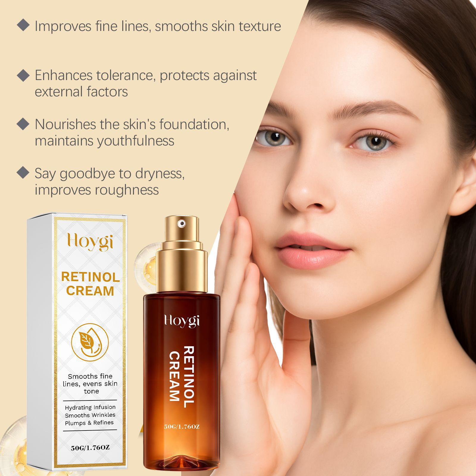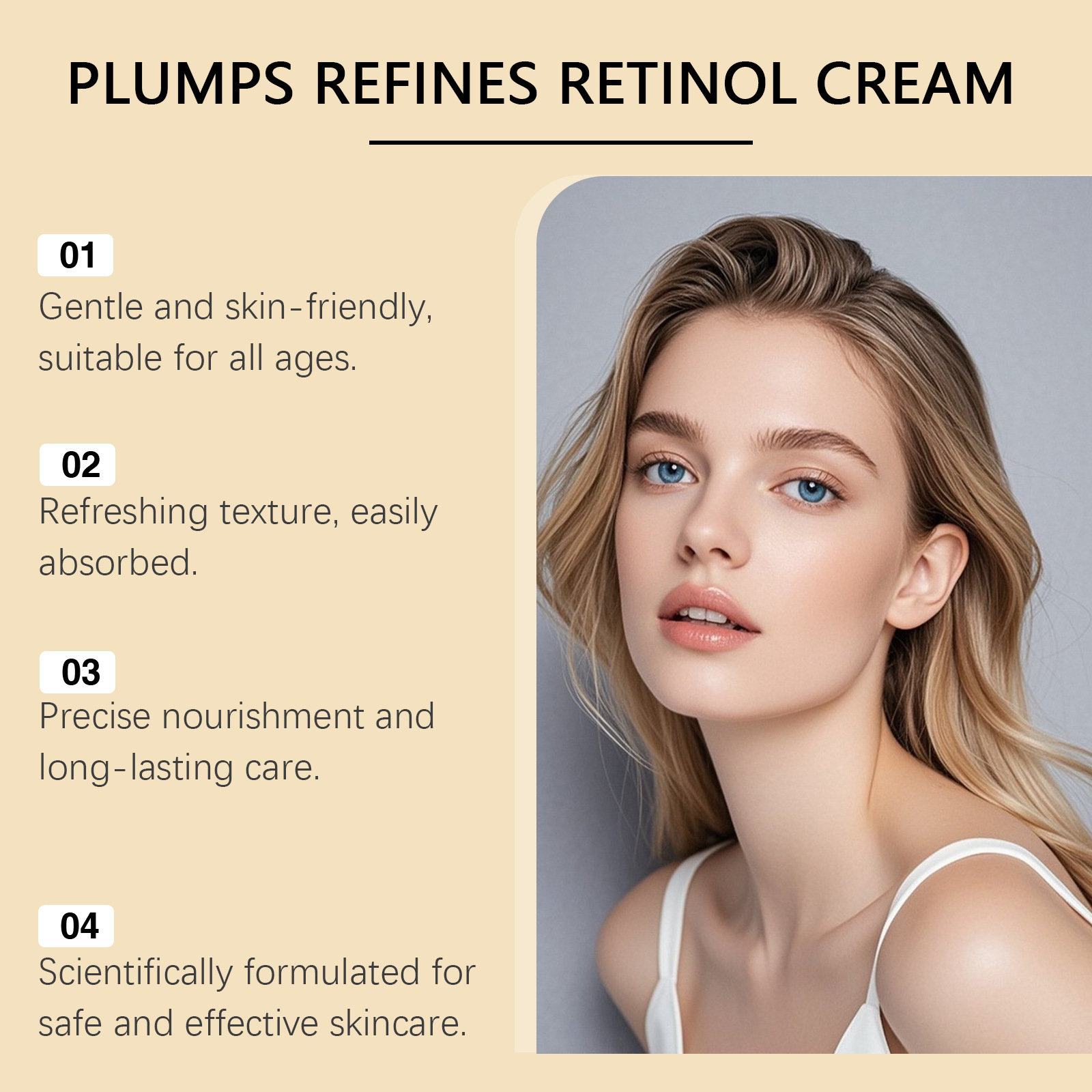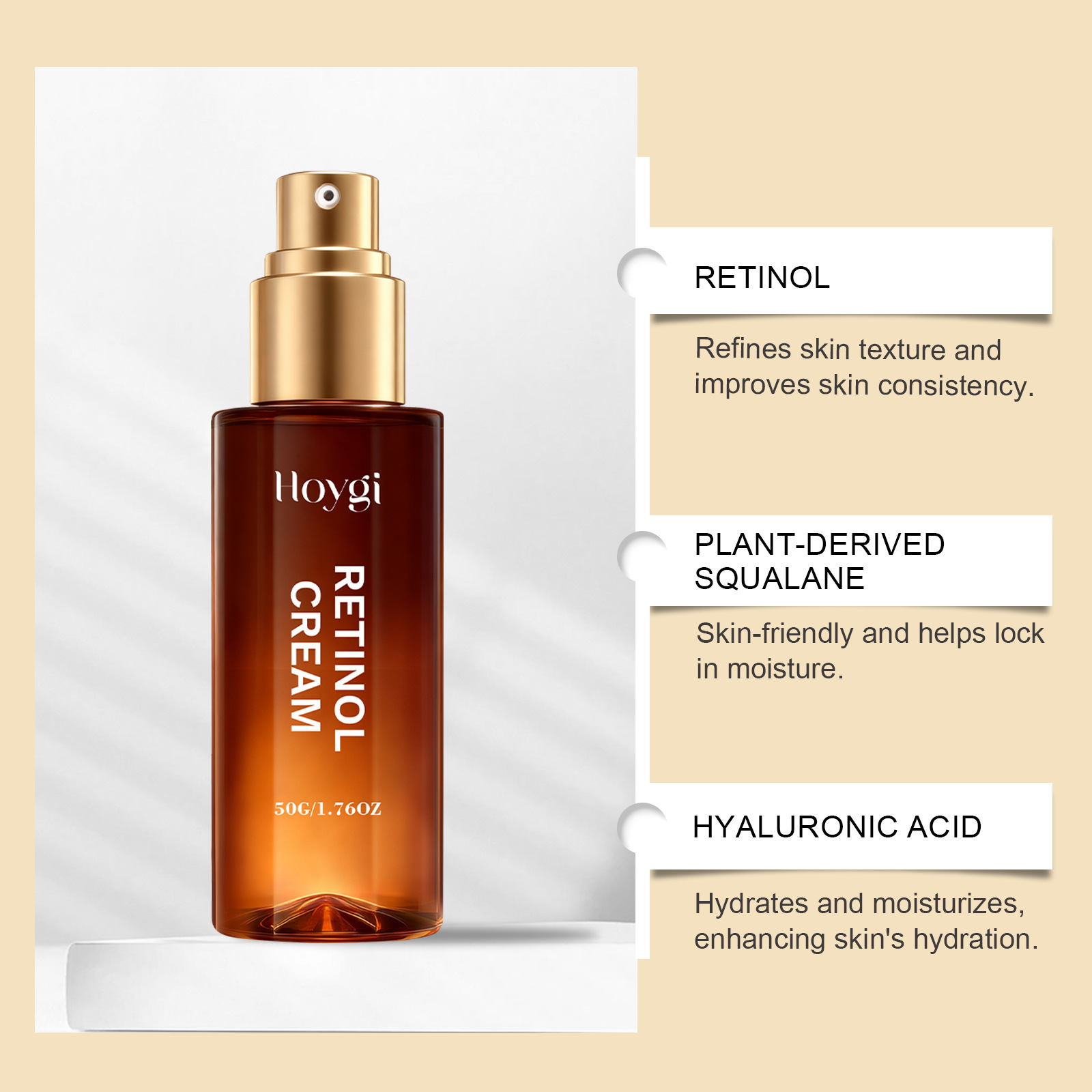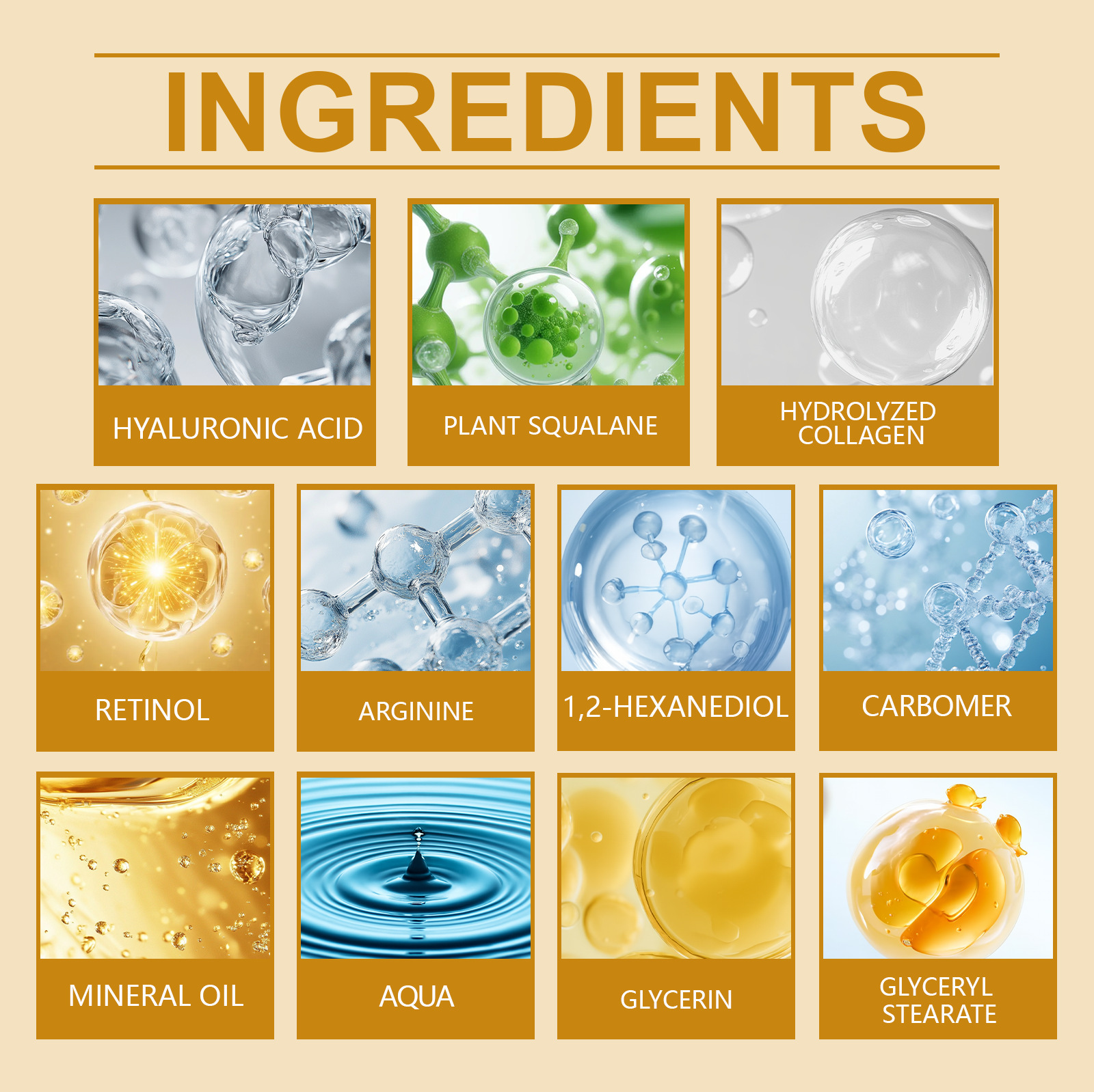 Ingredients: water, mineral oil, glycerin, glycerol stearate, 1,2- hexanediol, carbopol, arginine, hydrolyzed collagen, retinol, plant squalane, hyaluronic acid.