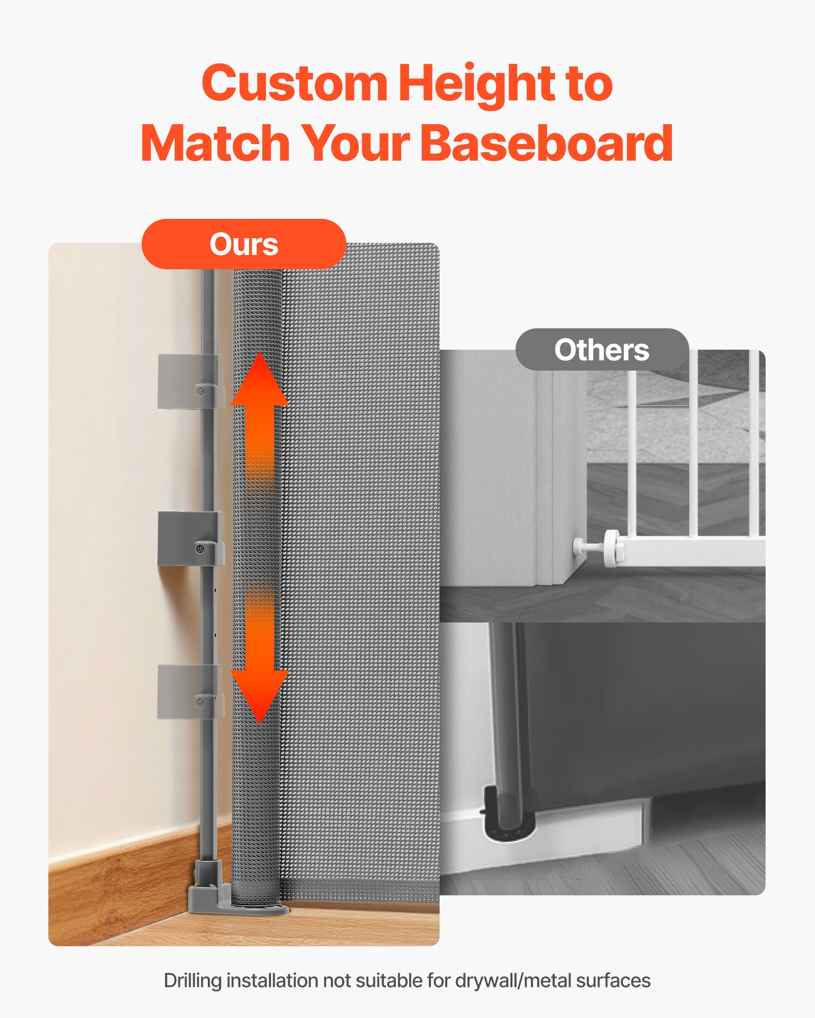 Features & Details Escape-Proof Bottom Hook: Pets and toddlers love to explore—this retractable baby gate features a reinforced bottom hook that reduces crawling through and blocks dangerous bottom gaps. It's paired with high-strength mesh for long-lasting durability Damage-Free Baseboard Fit: Lower brackets can be adjusted vertically, allowing the retractable dog gate to be mounted over baseboards without damage. All hardware is included for quick and easy installation Secure Separation Without Blocking View: The retractable gate is crafted from high-strength baby-grade PVC mesh that's soft to the touch, breathable, and see-through, so you can monitor your baby or pet from a distance while creating a secure barrier Easy One-Handed Operation: Designed for convenience, our mesh baby gate opens in one simple step using just one hand. No juggling items or struggling with locks. Get through quickly and smoothly, even while carrying groceries, a baby, or other items Retractable & Clutter-Free: When retracted, the retractable pet gate disappears into its housing, keeping your space tidy and walkways fully open. Designed without a bottom threshold to reduce tripping and ensure secure daily use for kids and pets