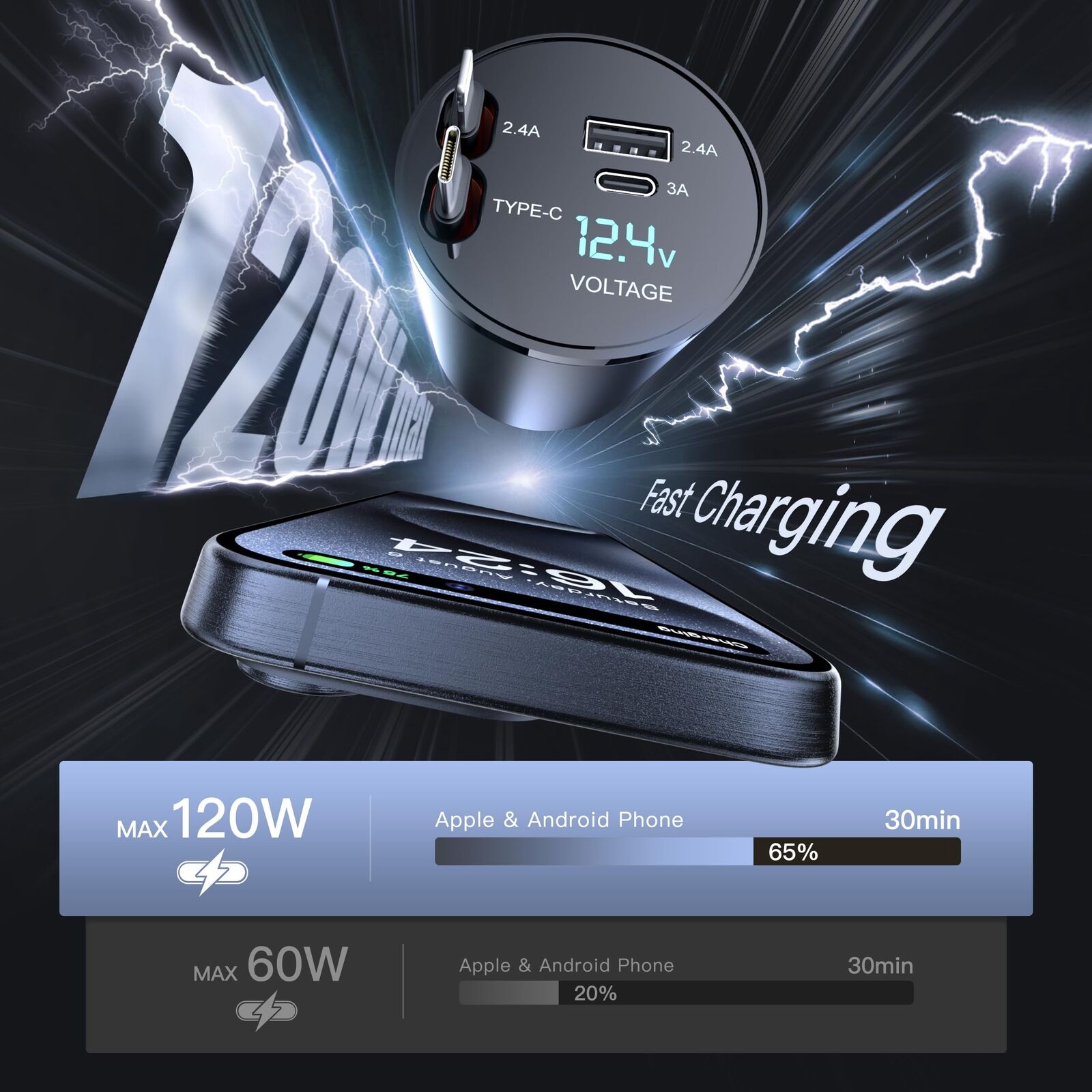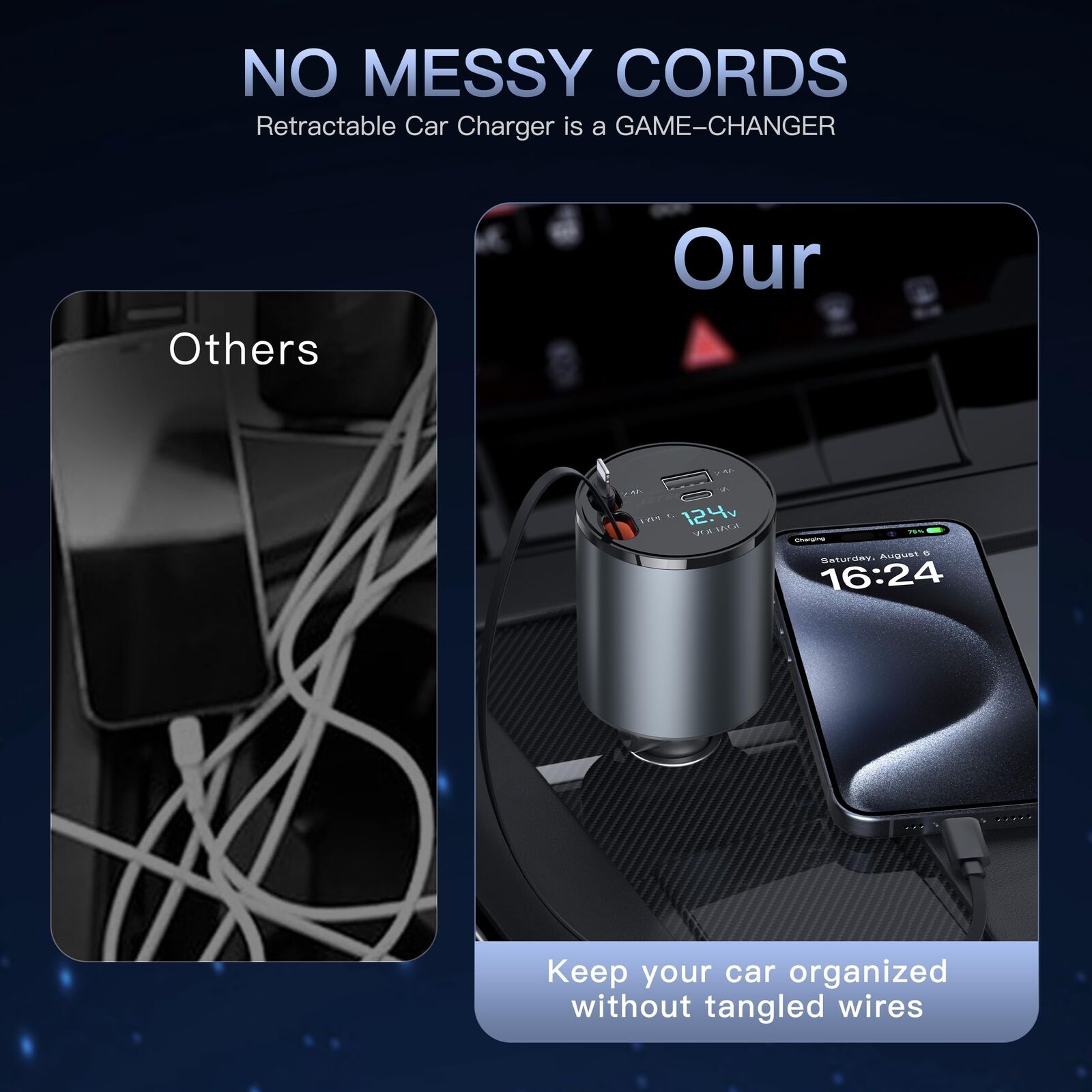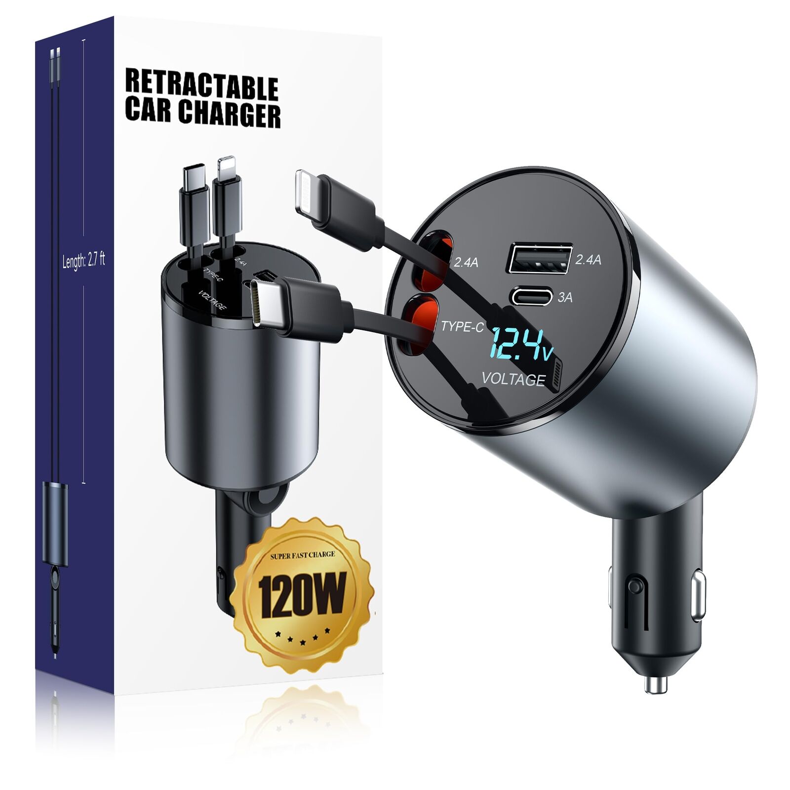 Retractable Car Charger( Upgrade To120W ), 4 in 1 Super Fast Charge Car Phone Charger, Retractable Cables and 2 USB Ports, Car Charger Adapter for iPhone 15/14/13/12 Pro Max XR, iPad, Samsung