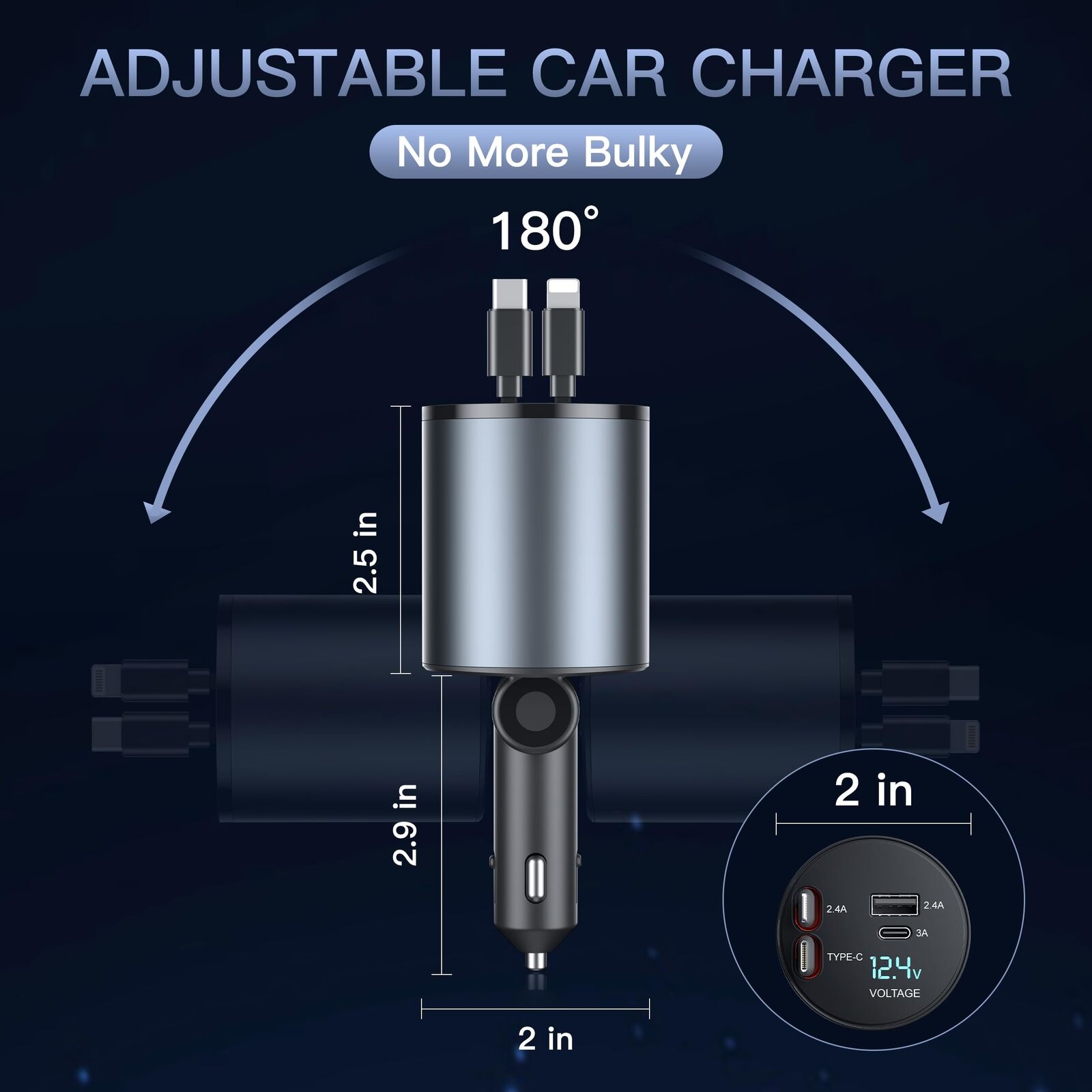 【Retractable Charging Cables】Our car charger has 2 retractable charging cables, Type-C and lighting cables, with a freely retractable length of 2.7 feet. You could have fast charging in the back seat,Keep your car tidy.