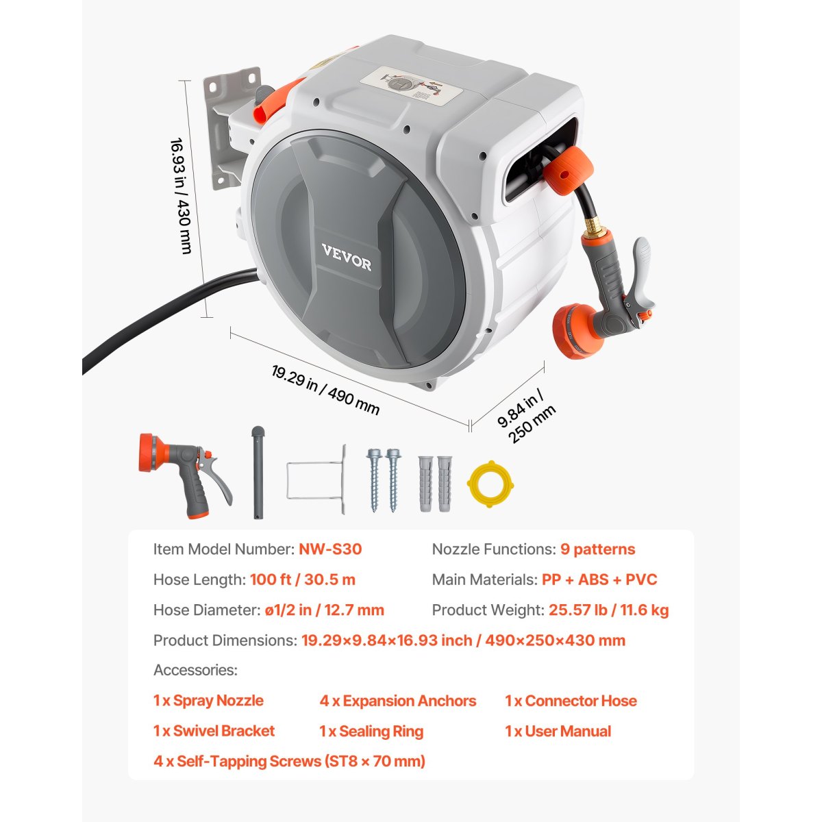 Multi-Function Spray Nozzle: This garden hose with reel comes with 9 spray patterns to handle garden watering, car washing, pet bathing, and higher-pressure cleaning tasks like driveways