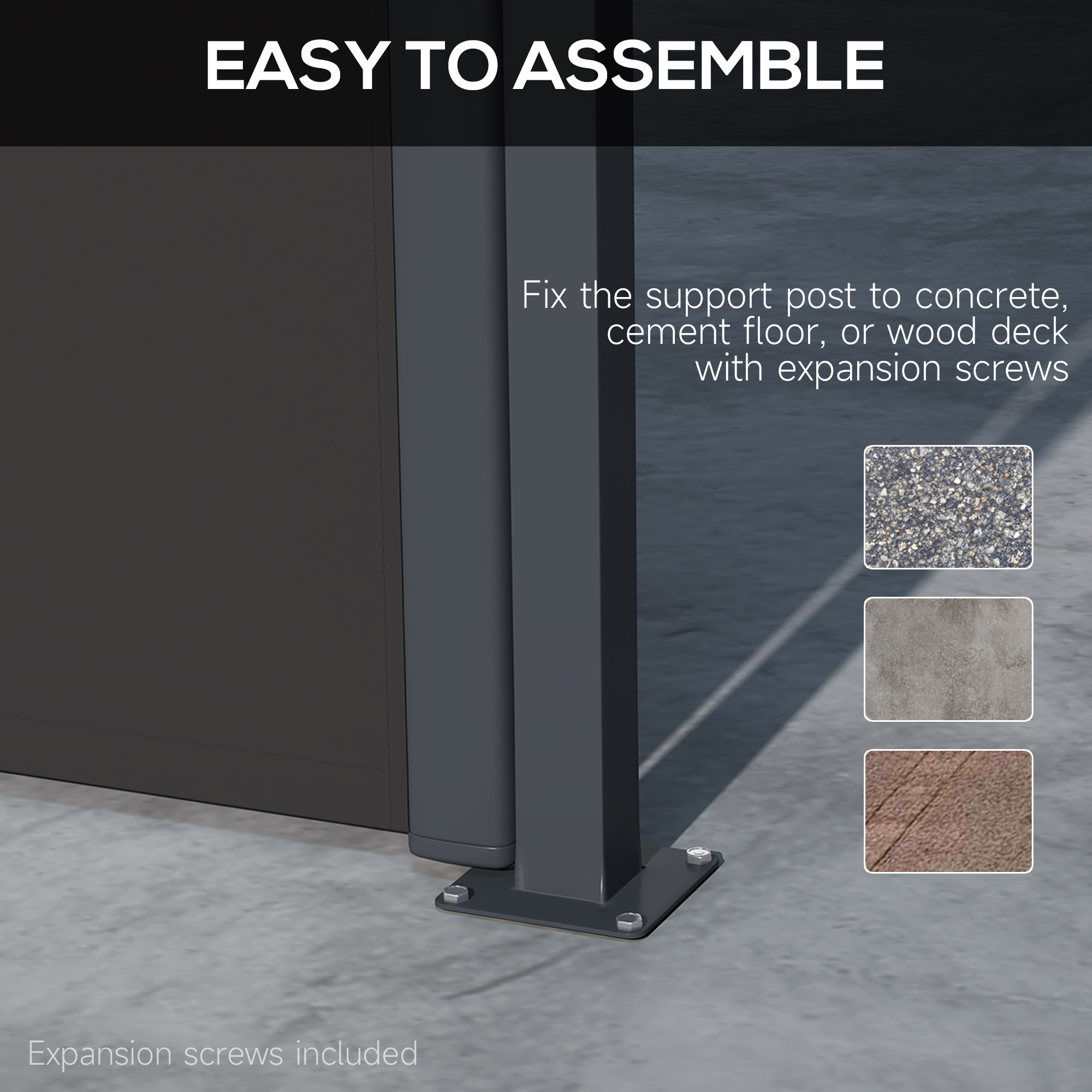 Prevent sun and wind from disturbing your outdoor time. Bring this retractable garden screen into your relaxation space. The metal base frame ensures it attaches securely to chosen space. Pull out the canopy smoothly; fix in place with the clip lock handle - a simple operation. A great way to extend your time out in the garden.