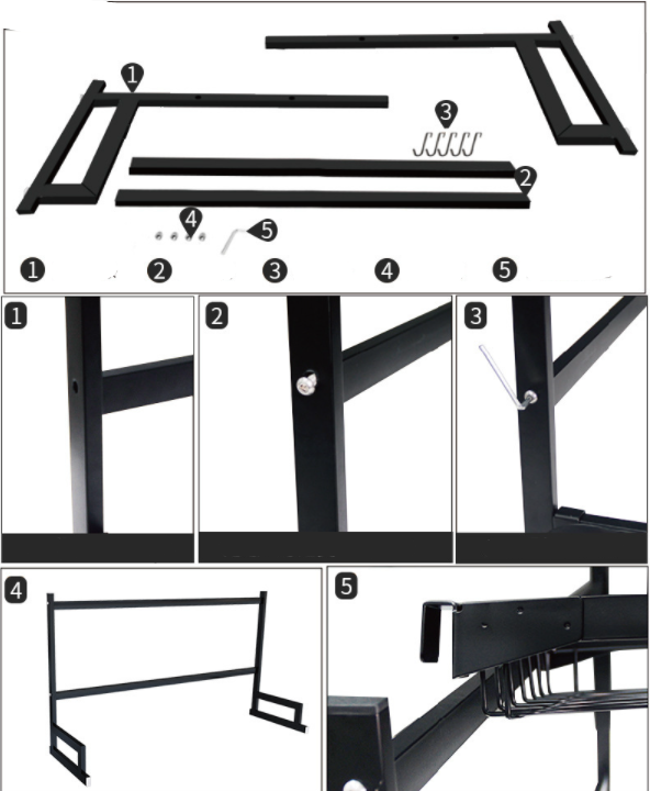 1. h brackets x2; 2. cross bars x2; 3. hooks x5;