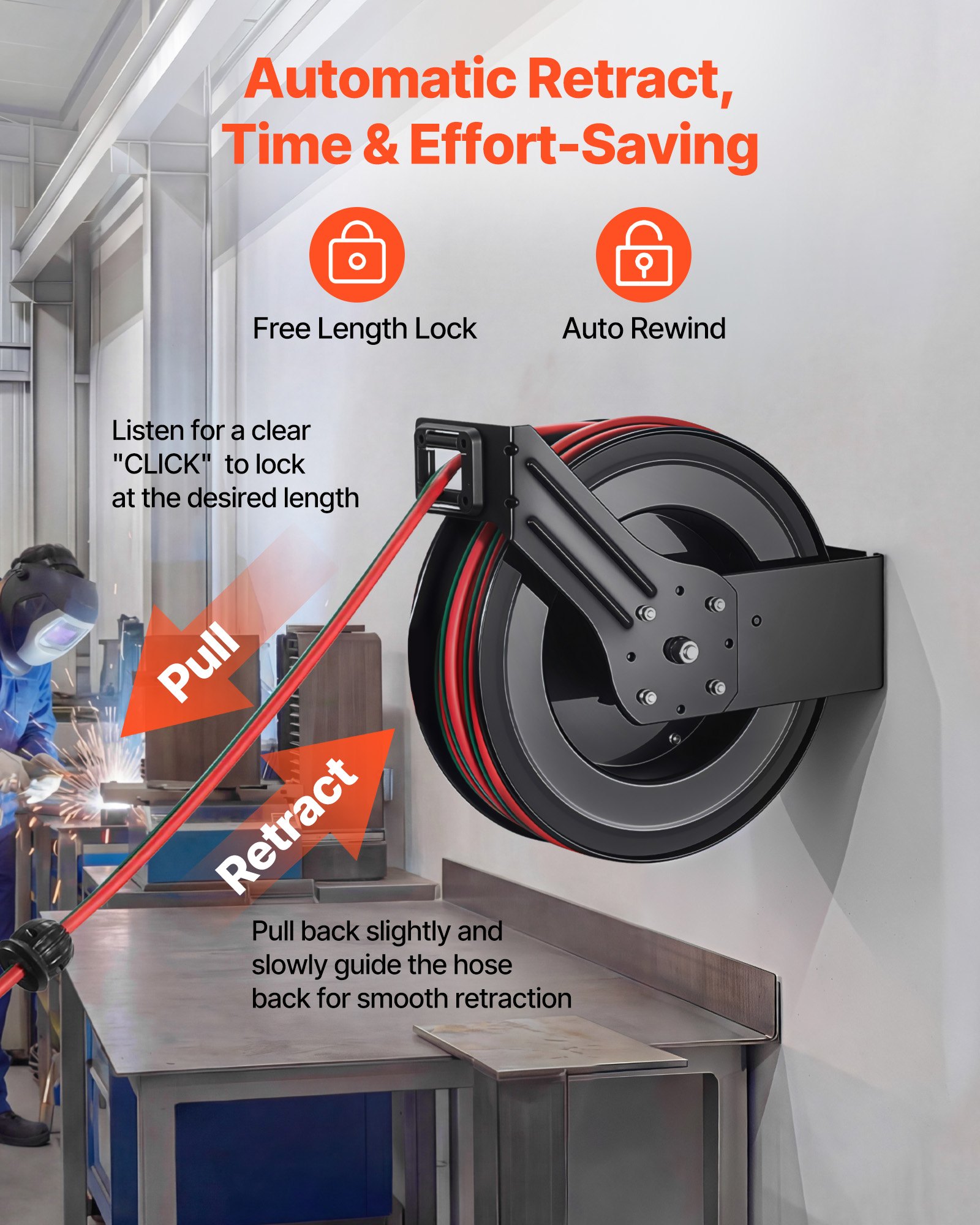 Built to Last: Our retractable welding hose reel features a steel housing with a powder-coated finish, delivering long-lasting durability and corrosion resistance. Built to withstand demanding welding environments and provide reliable hose protection