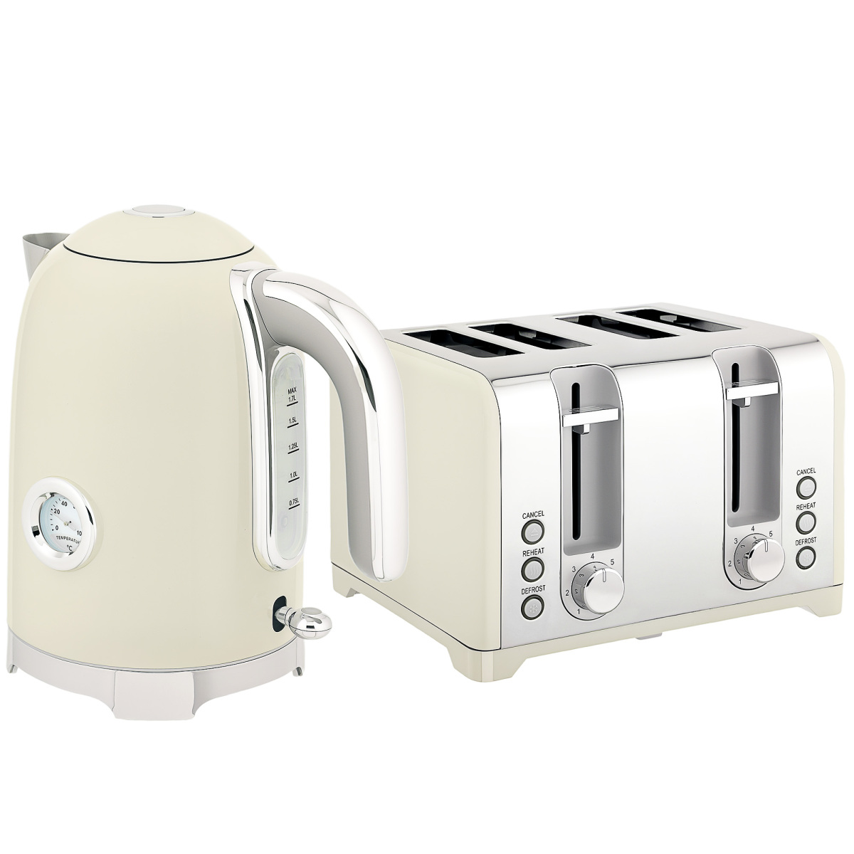 Take mornings back in time, with this toaster and kettle set. The solid black colour and silver-tone accents merge with the super-curved shape for a retro look - a statement piece for countertops. The 1.7L capacity of the kettle boils enough water for seven cups, so the whole family can enjoy a hot beverage at once. The four-slice toaster has seven browning levels and defrost/reheat/cancel functions.