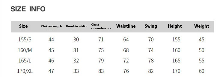 Size :155/S 160/M 165/L 170/XL