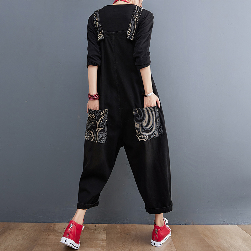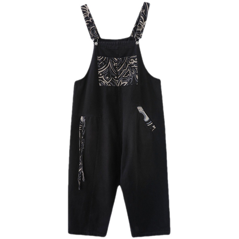 Retro Casual Patchwork Design Jeans Suspenders Wide Leg Pants For Women