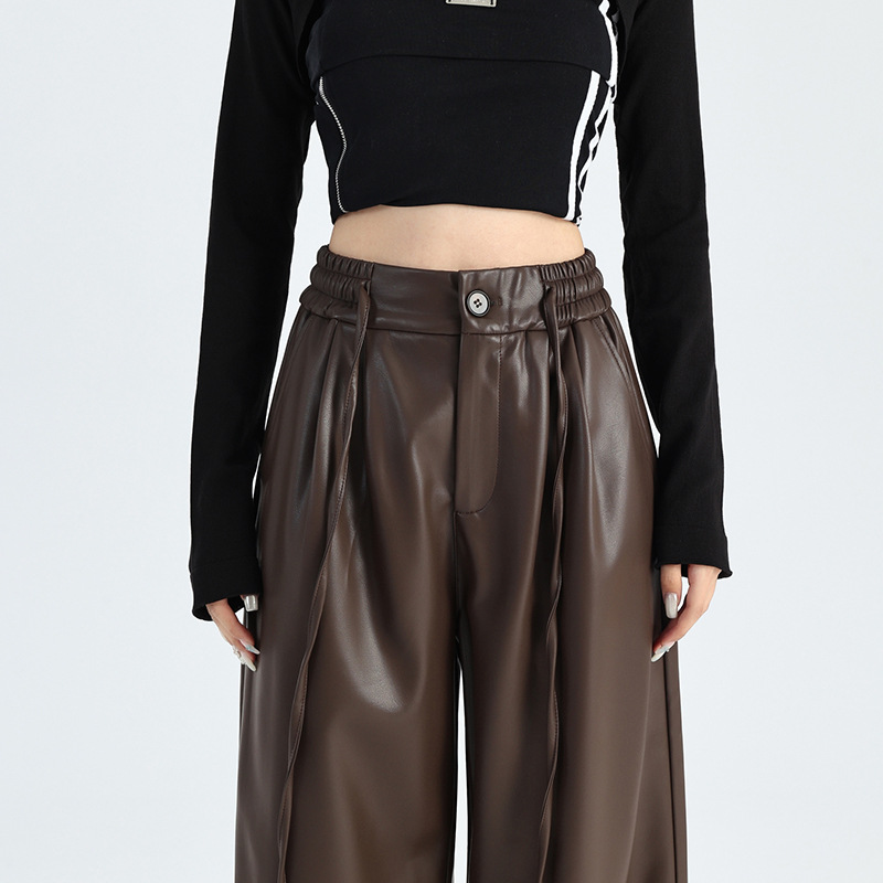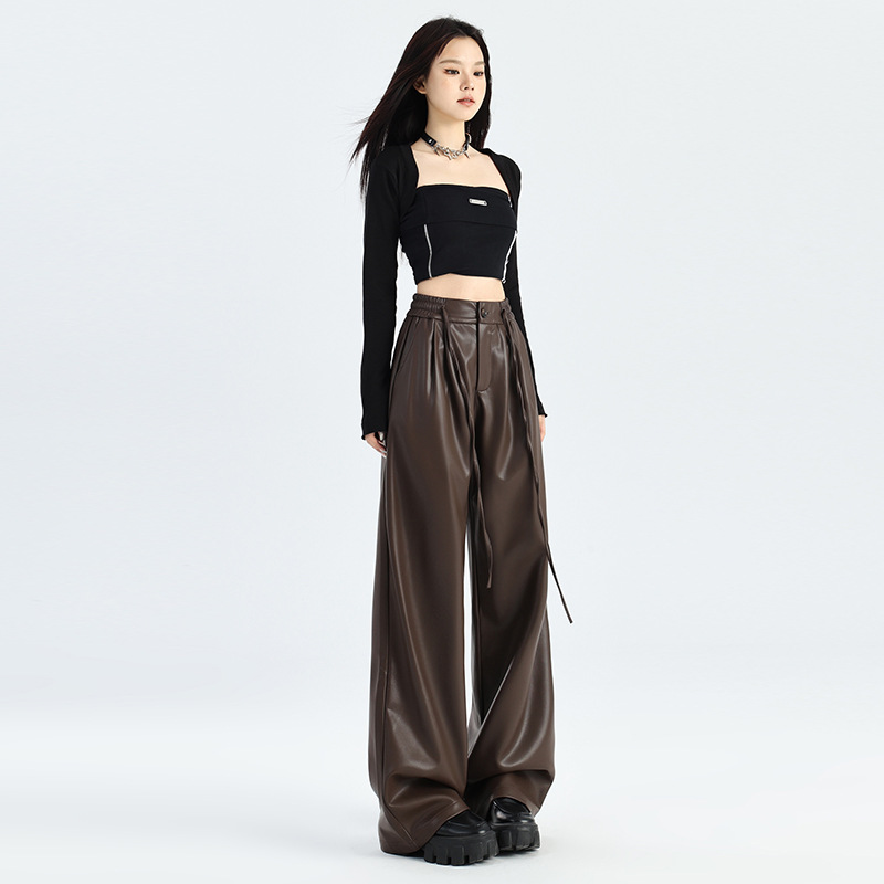 Retro Coffee Color Leather Pants Women's PU Pleated Straight Wide-leg Pants