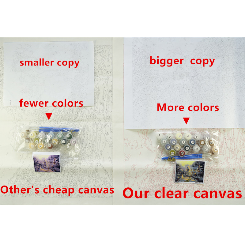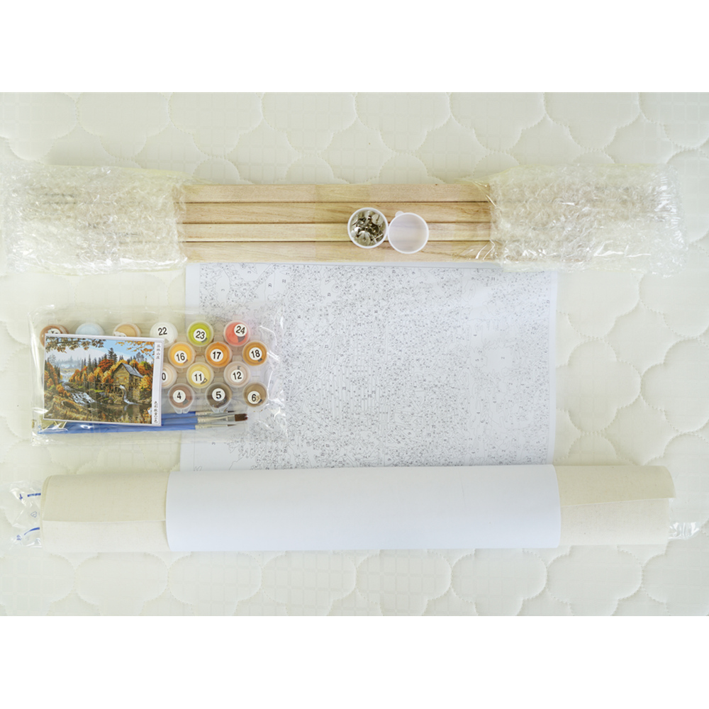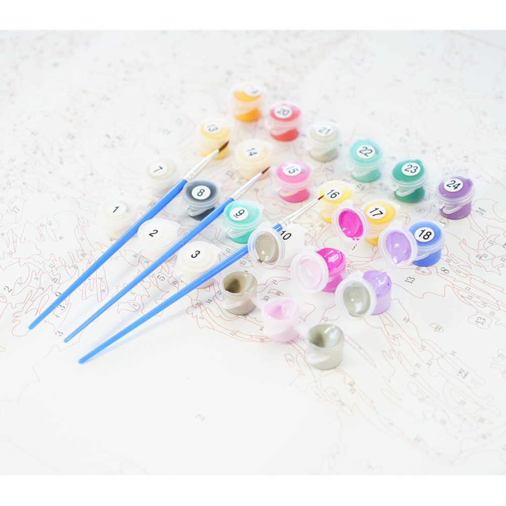 What's inside: 3 brushes on linen canvas; 1 set of acrylic paint; instruction file; reference table; frame; pendant; screw