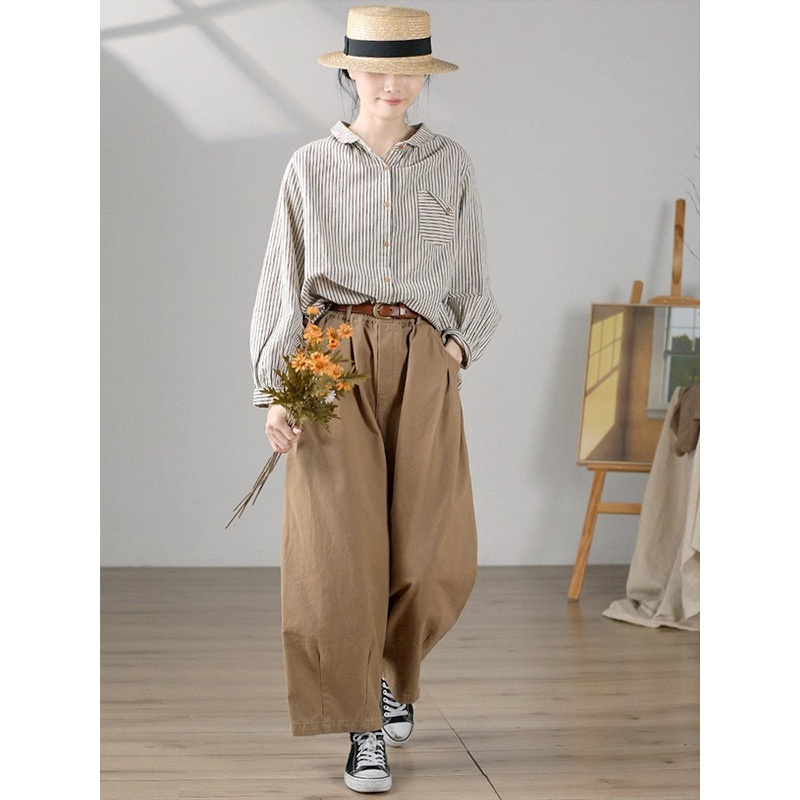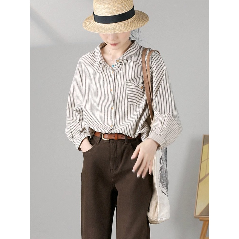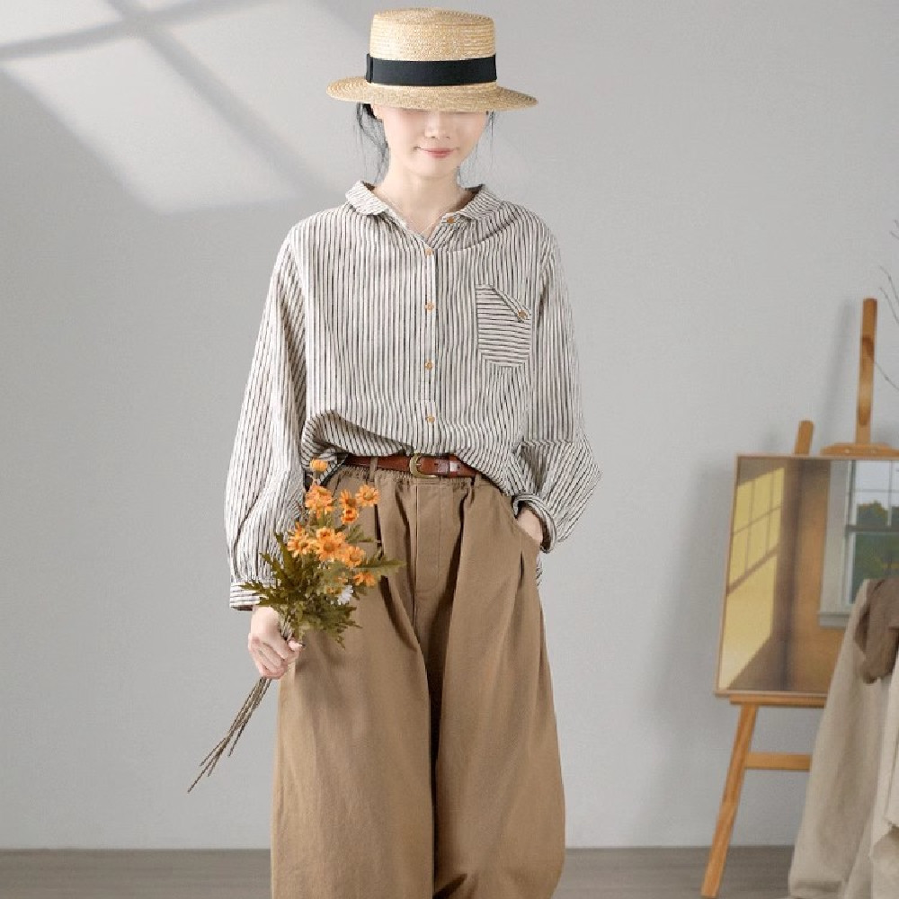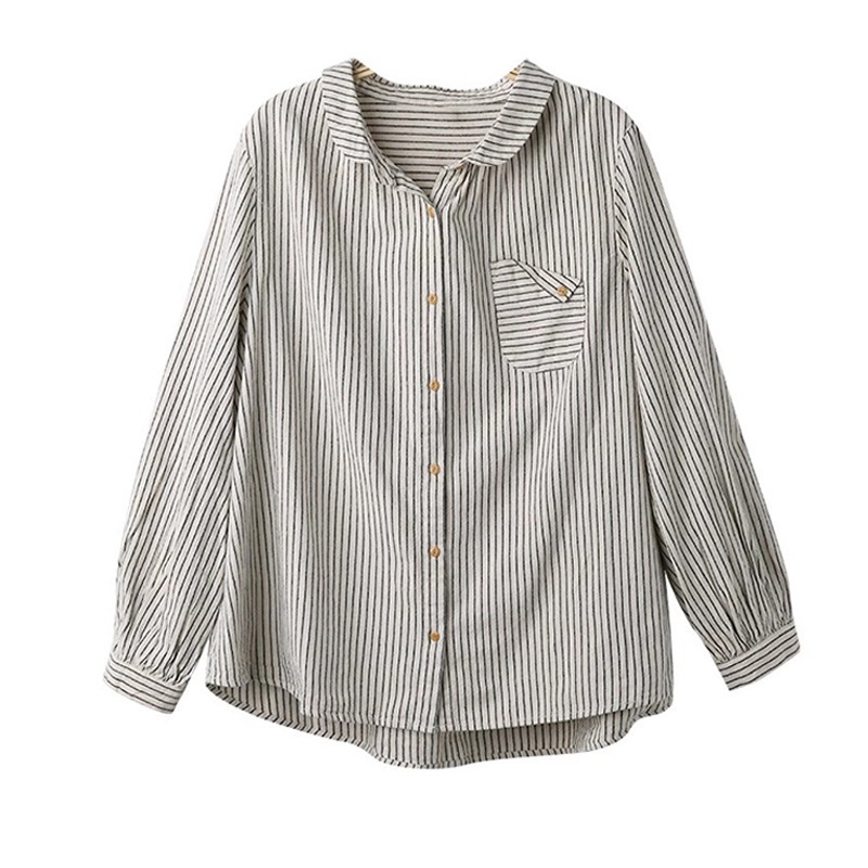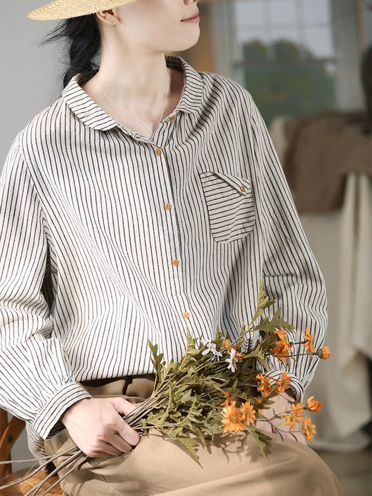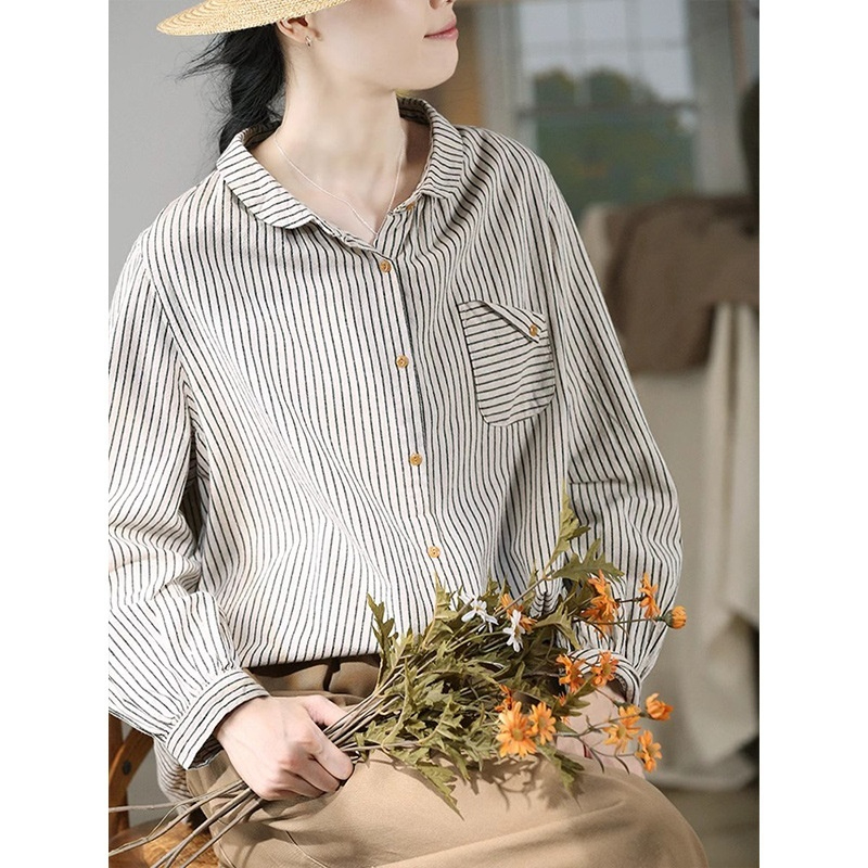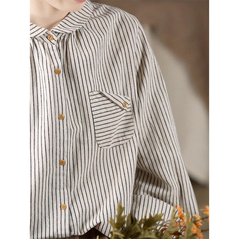 Retro Cotton Linen Long Sleeve Blouse Striped Brushed Original Art