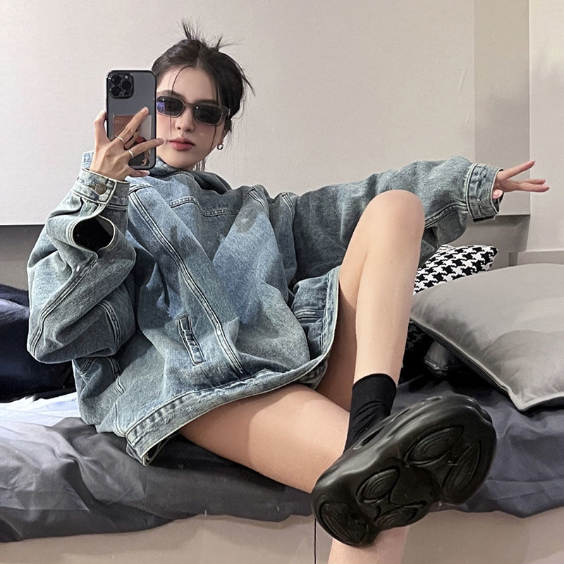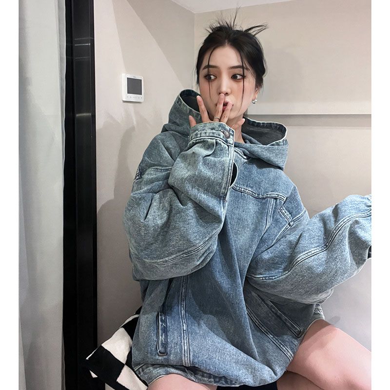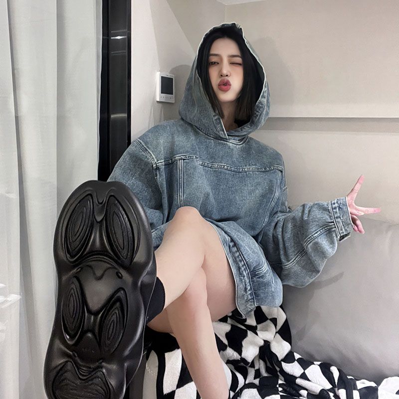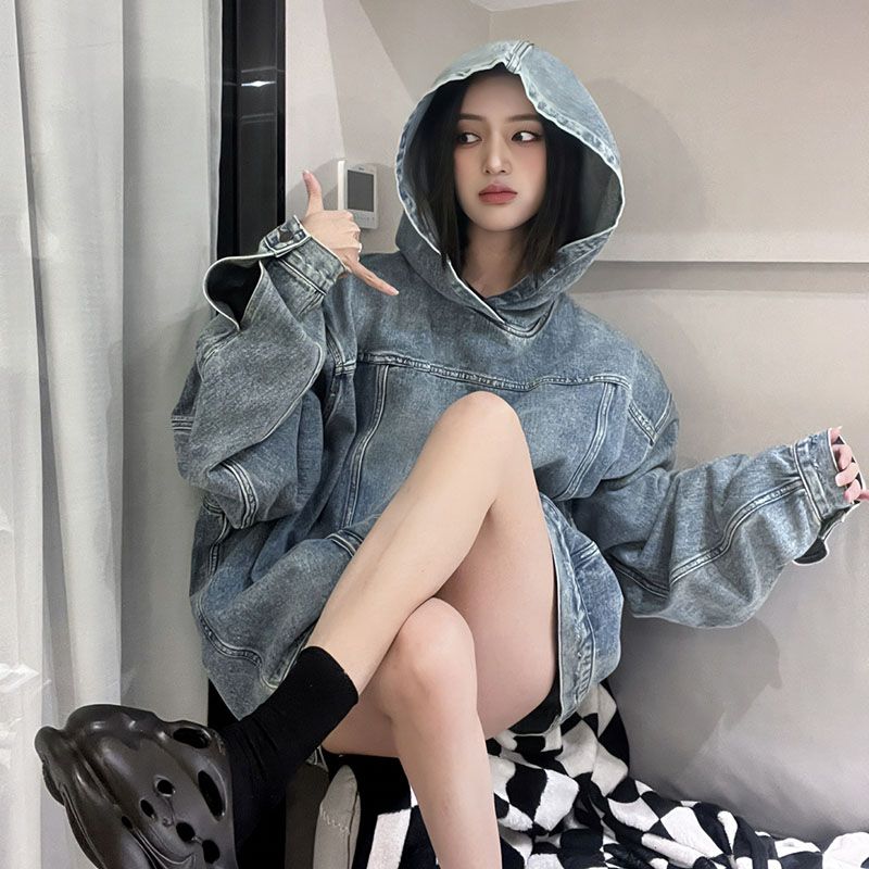 Retro Denim Hooded Sweater Women's Loose Mid-length Top