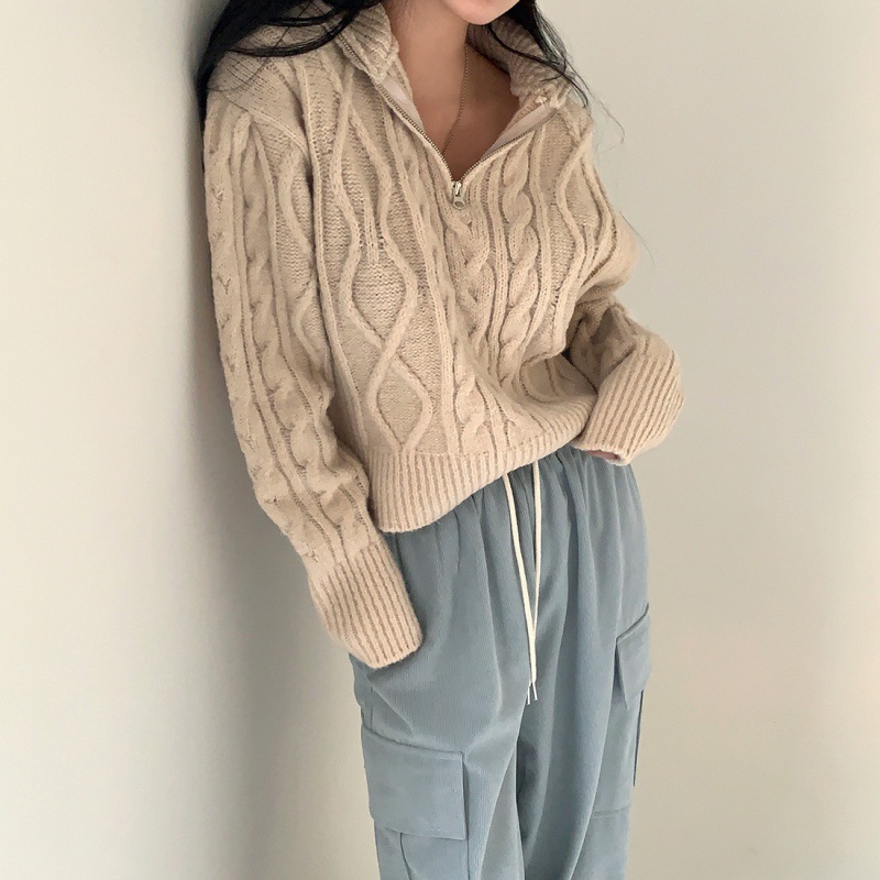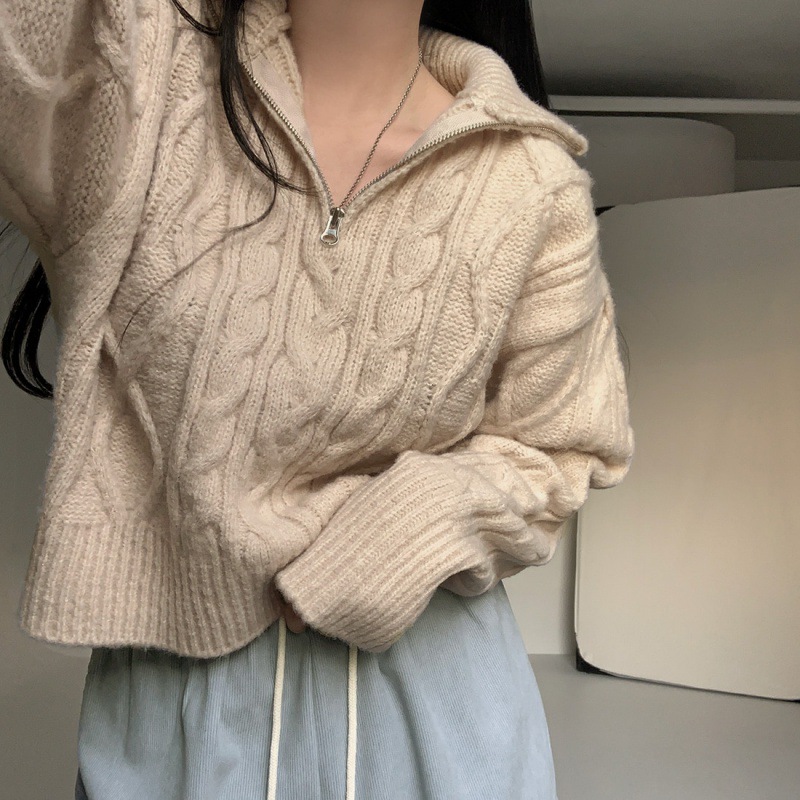 Retro Elegant Twist Zipper And Lapel Long Sleeve Sweater
