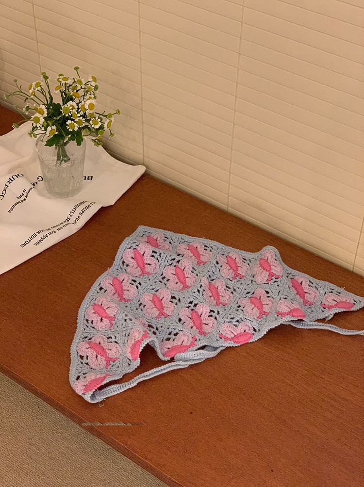 Color: pink, yellow, black, blue-green flower, butterfly, red flower, flower, frog