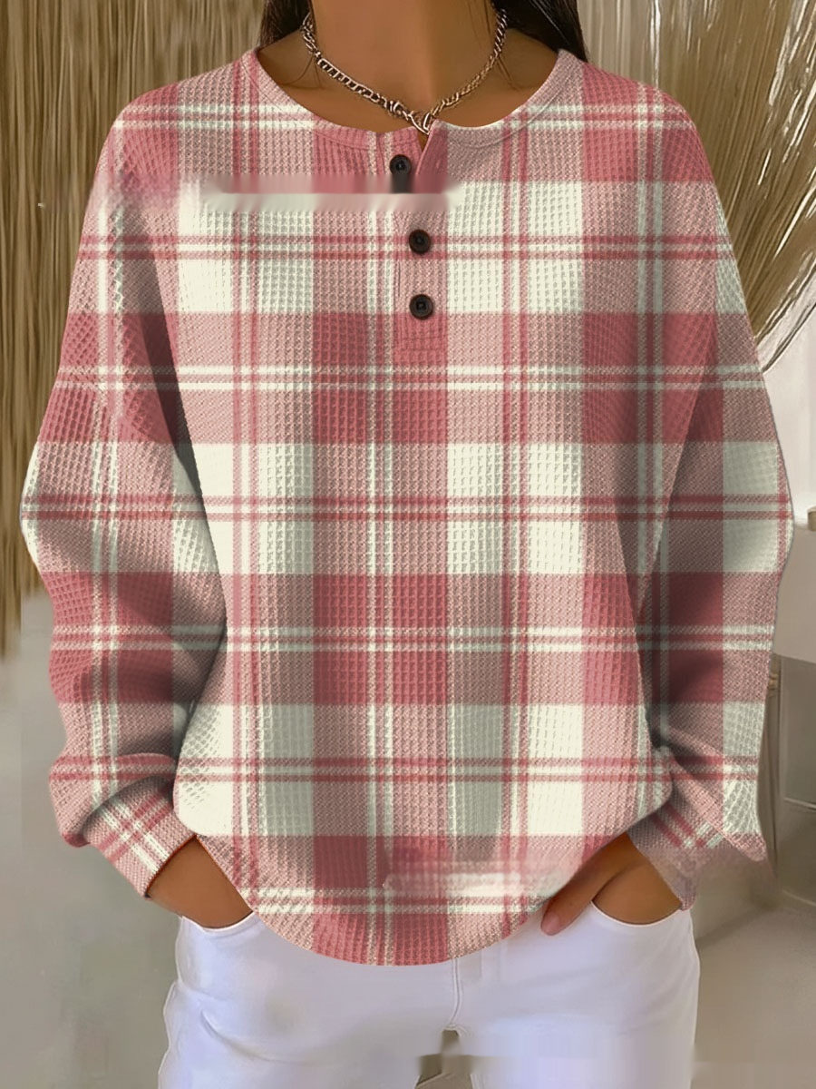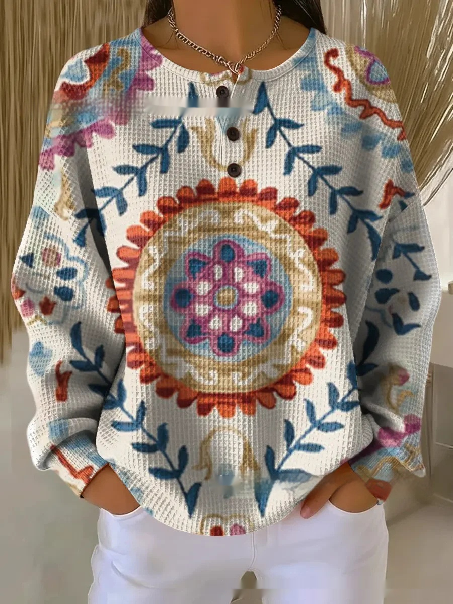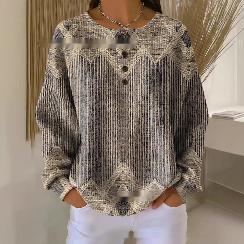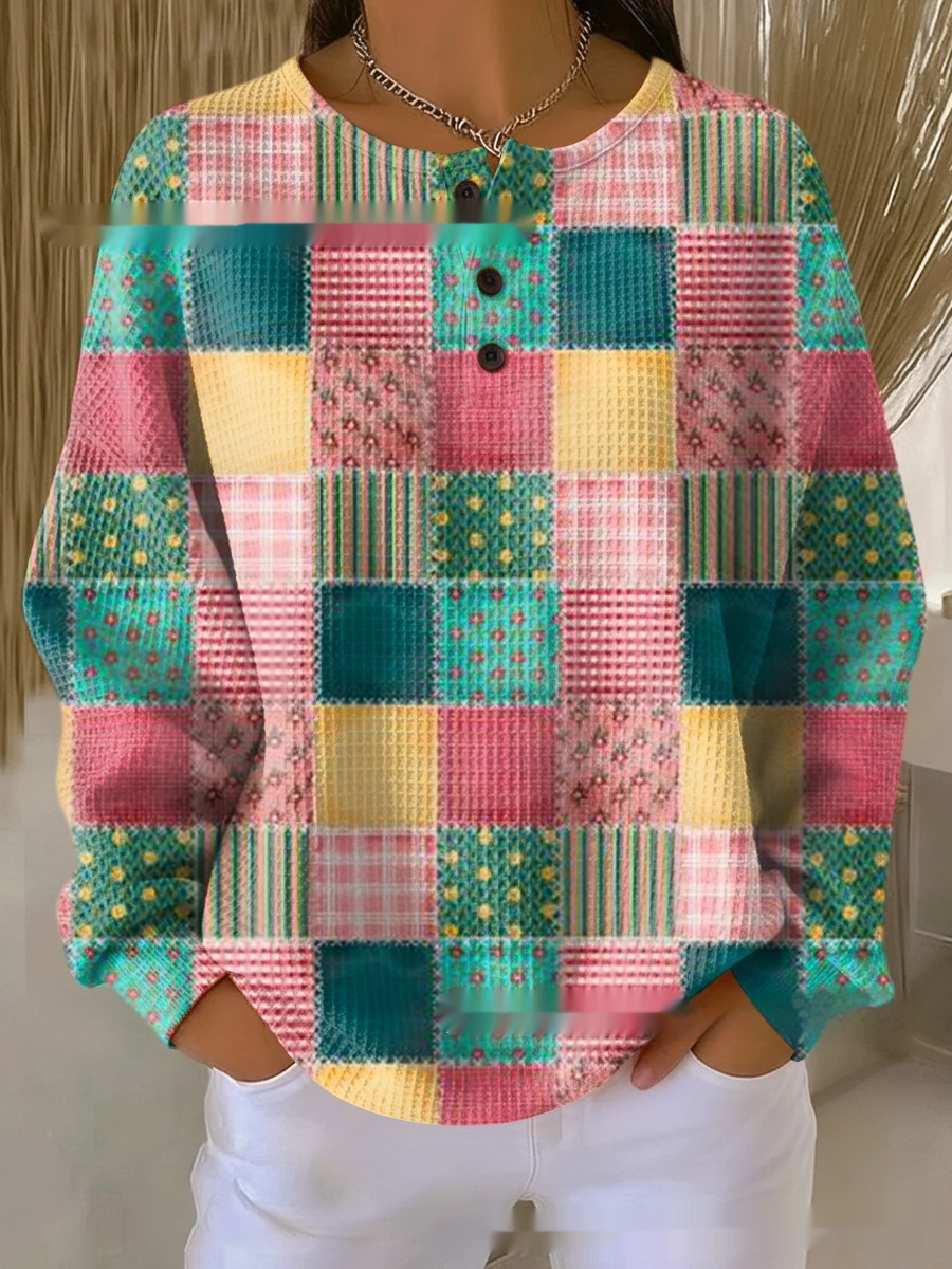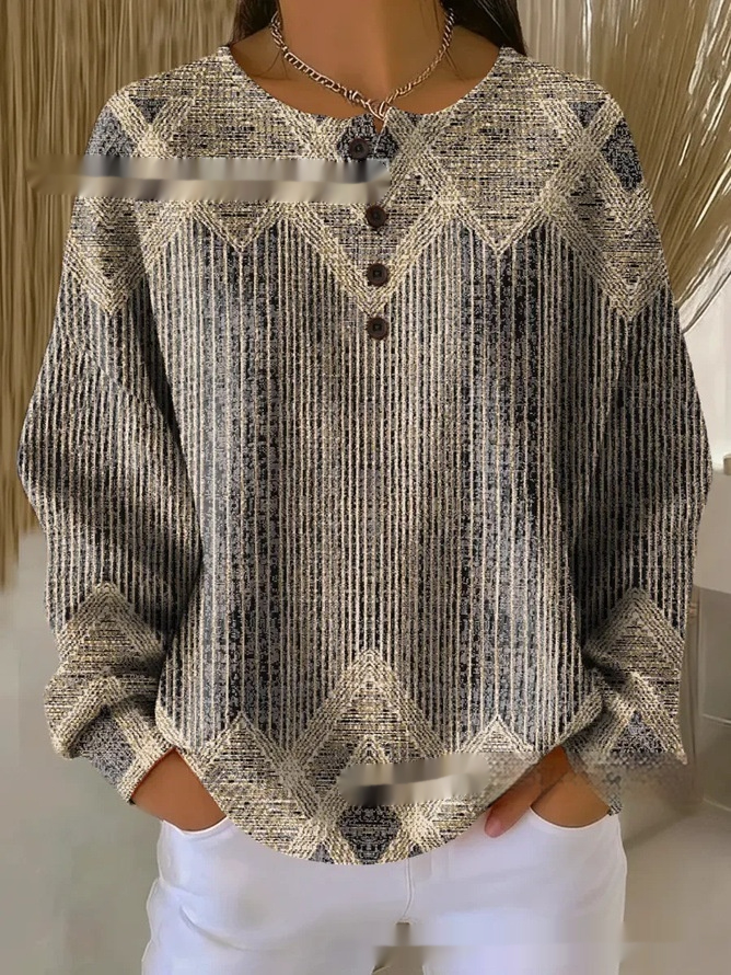 Retro Geometric 3D Digital Print Three-Button Stand-Up Collar Womens T-Shirt Top