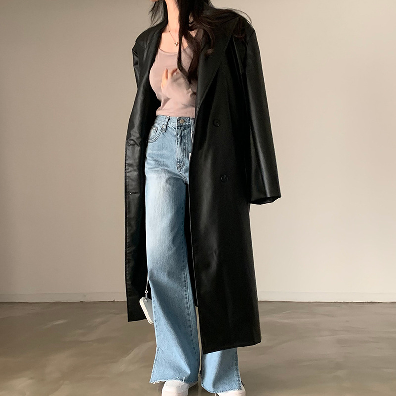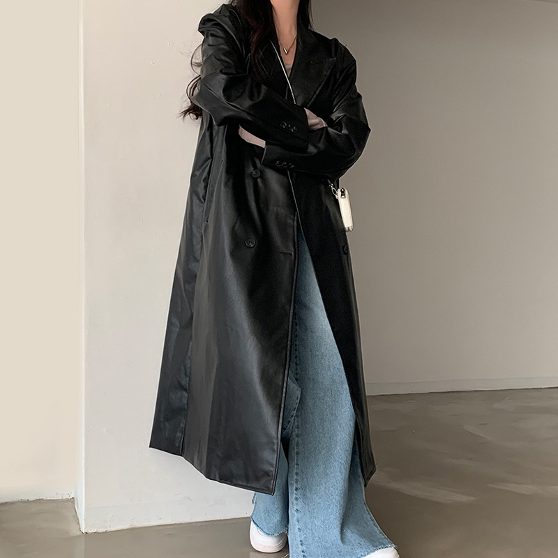 Retro Handsome Suit Collar Double Breasted Loose Casual PU Leather Long Sleeve