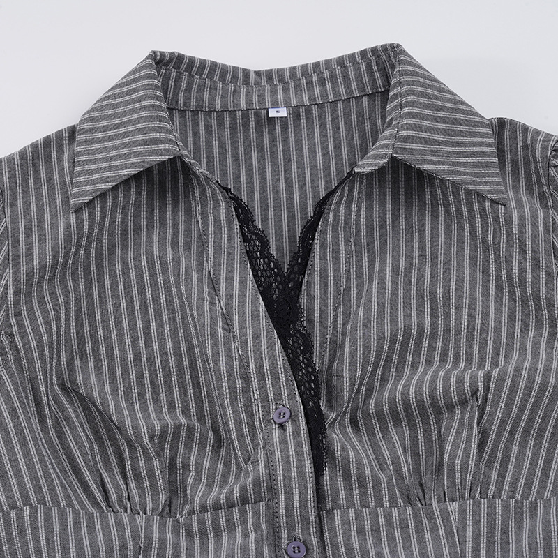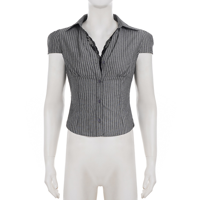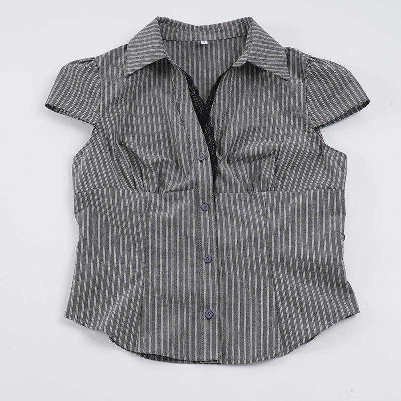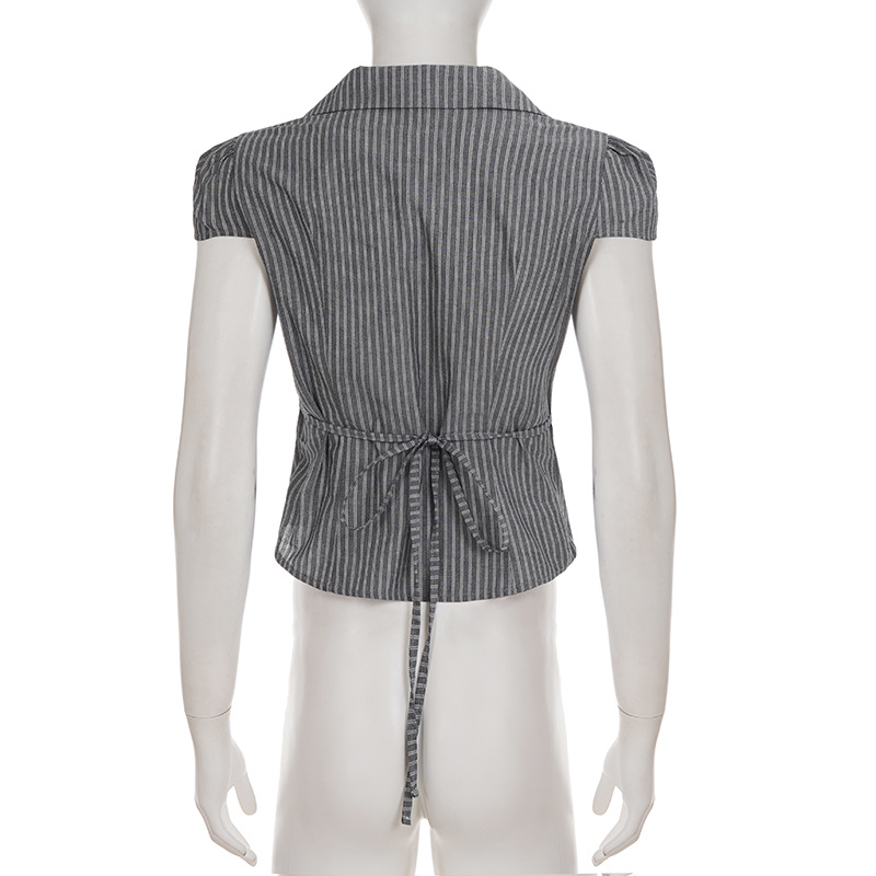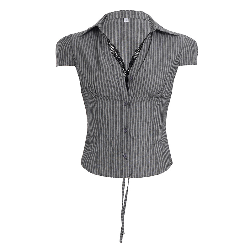 Retro Lace-Patchwork Striped Shirt Waist-Cinching Tie-Neck Short-Sleeve Top