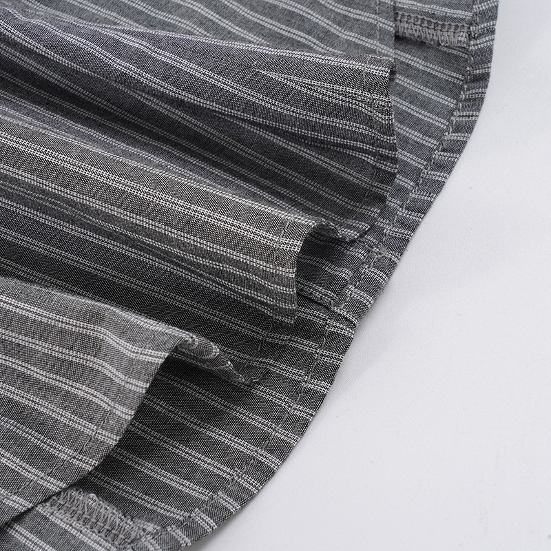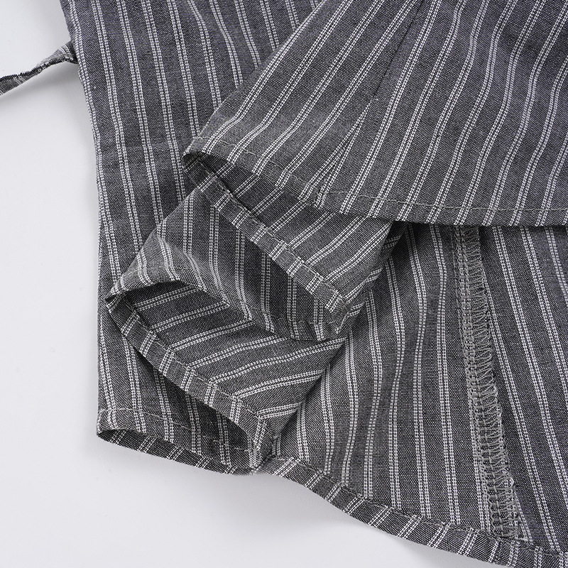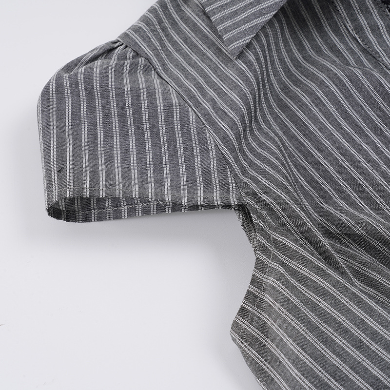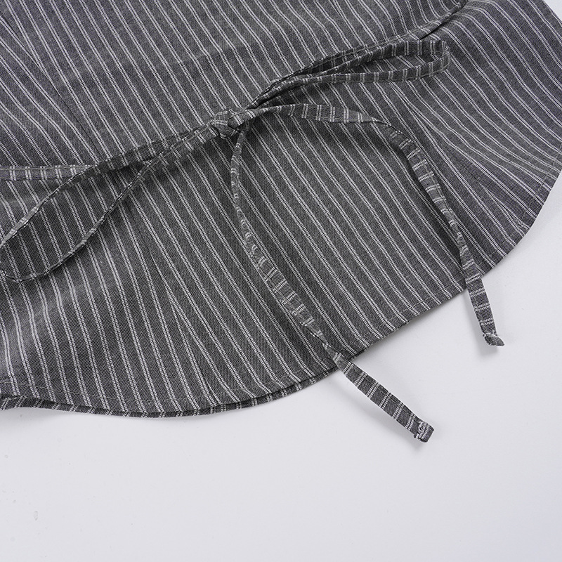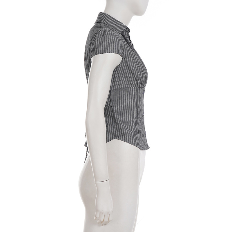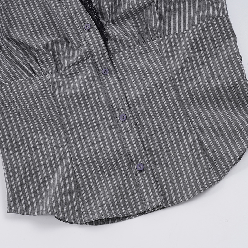 Retro Lace-Patchwork Striped Shirt Waist-Cinching Tie-Neck Short-Sleeve Top