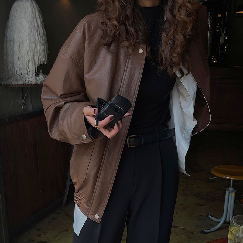 Retro Lapel Zipper Long Sleeve Pocket Motorcycle PU Leather Jacket