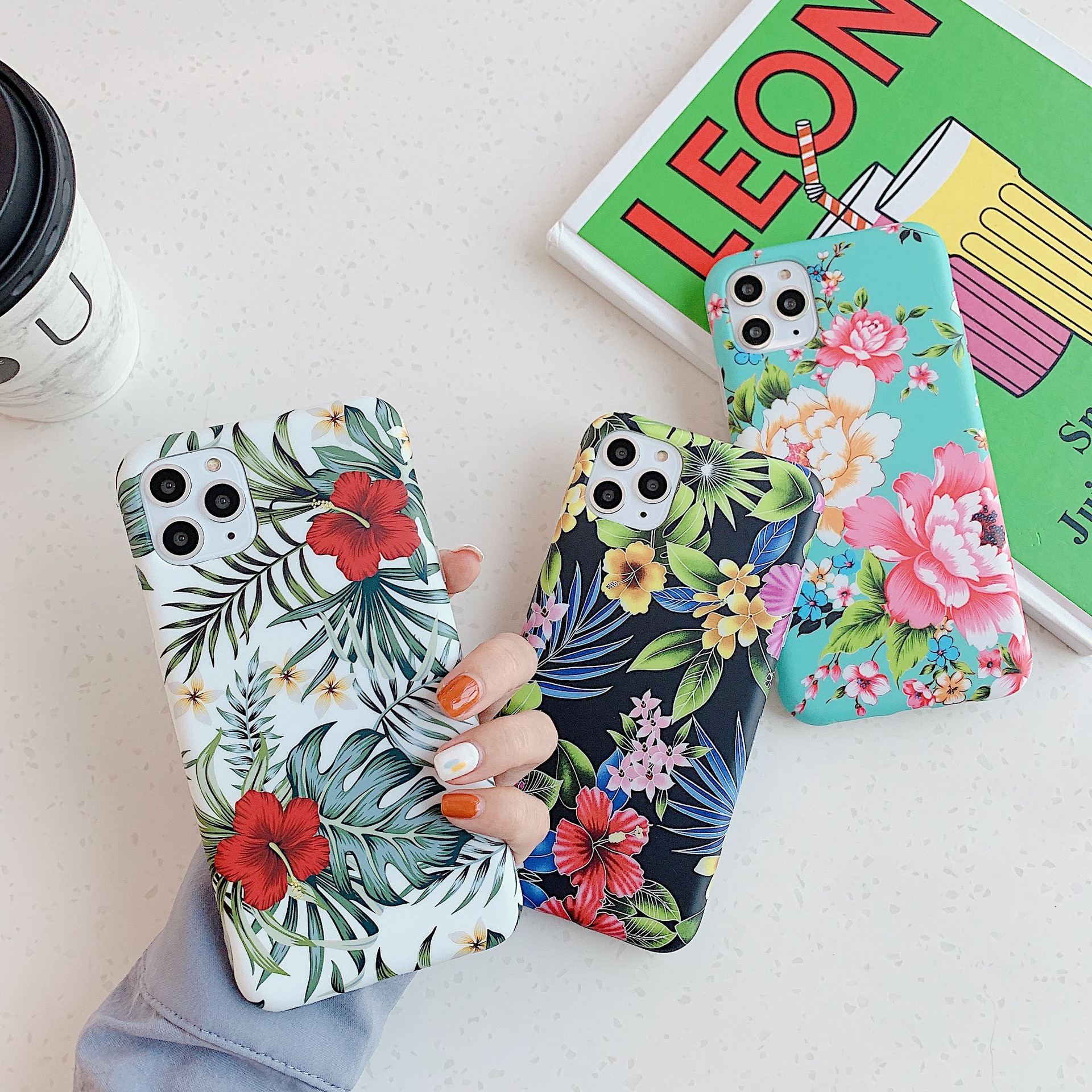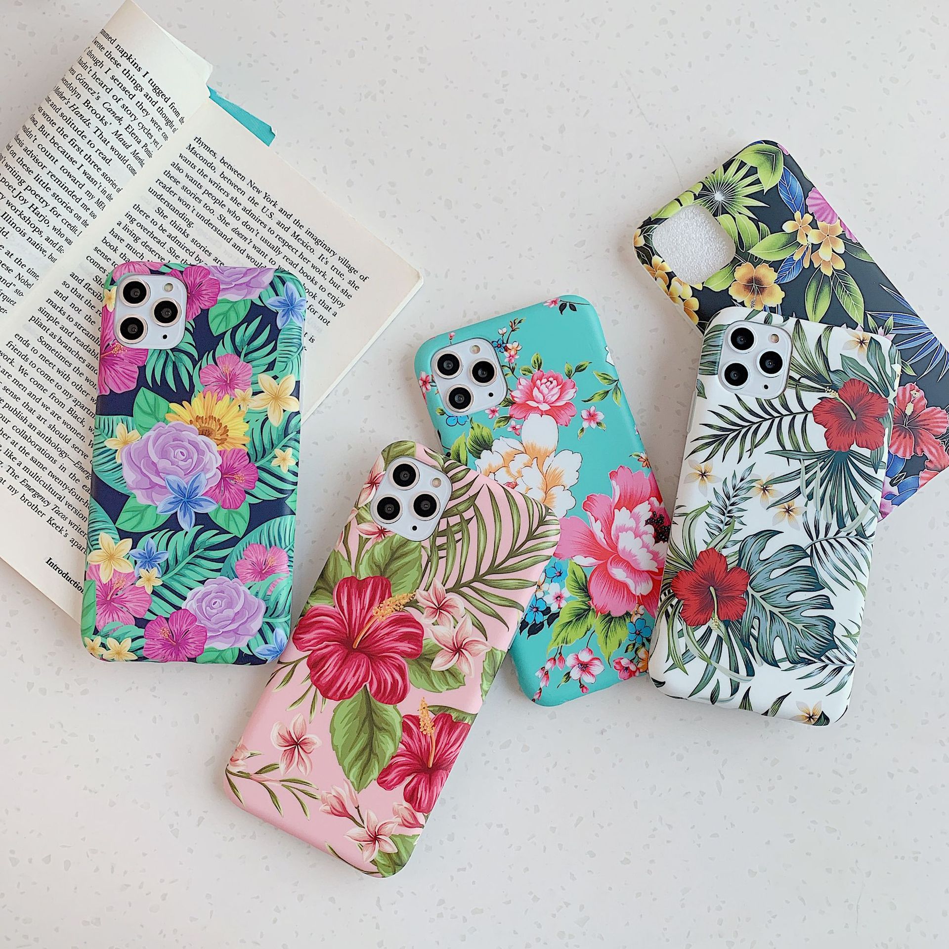 Color; 1 foundation flower, 2 white background green leaves, 3 green background large flowers, 4 flowers blooming, 5 green leaf flowers