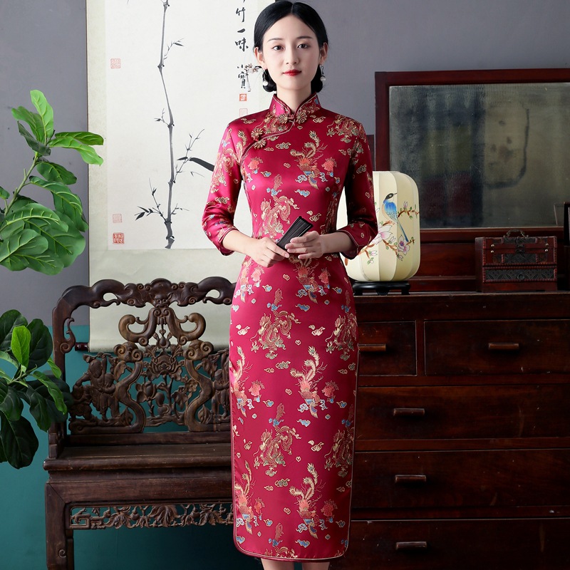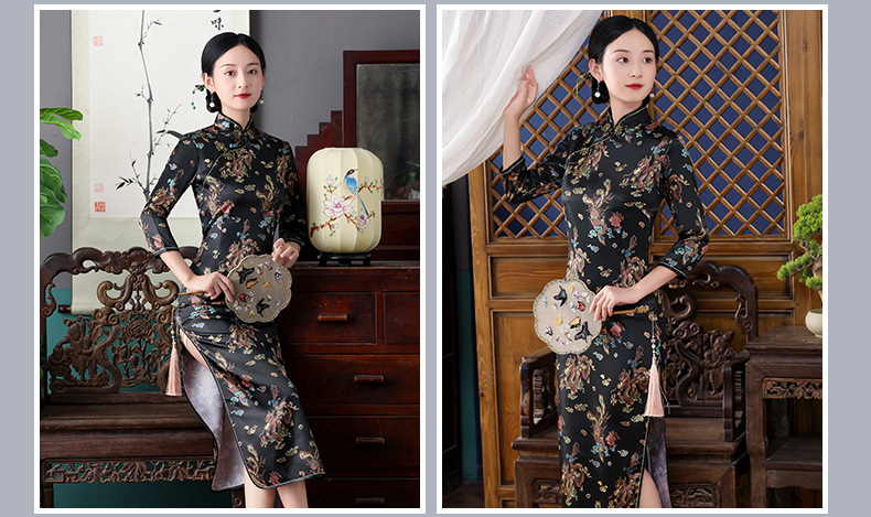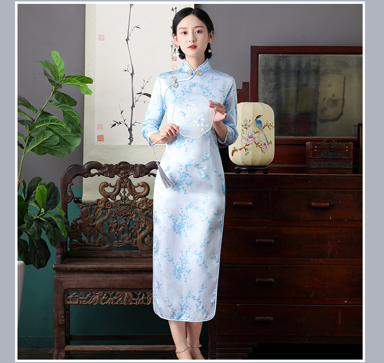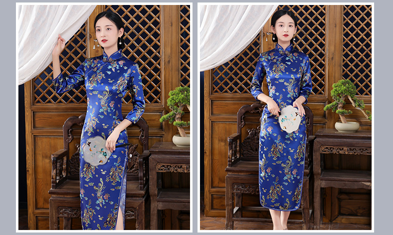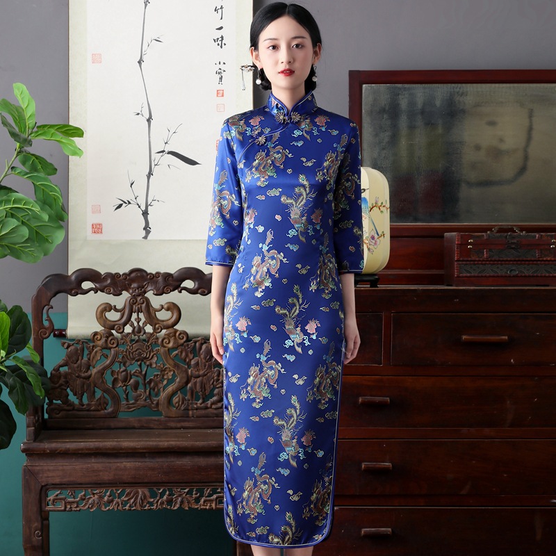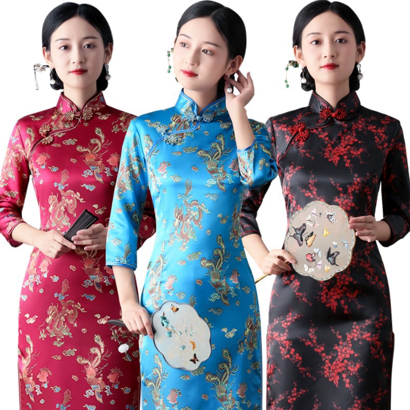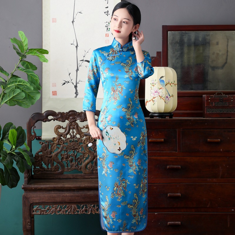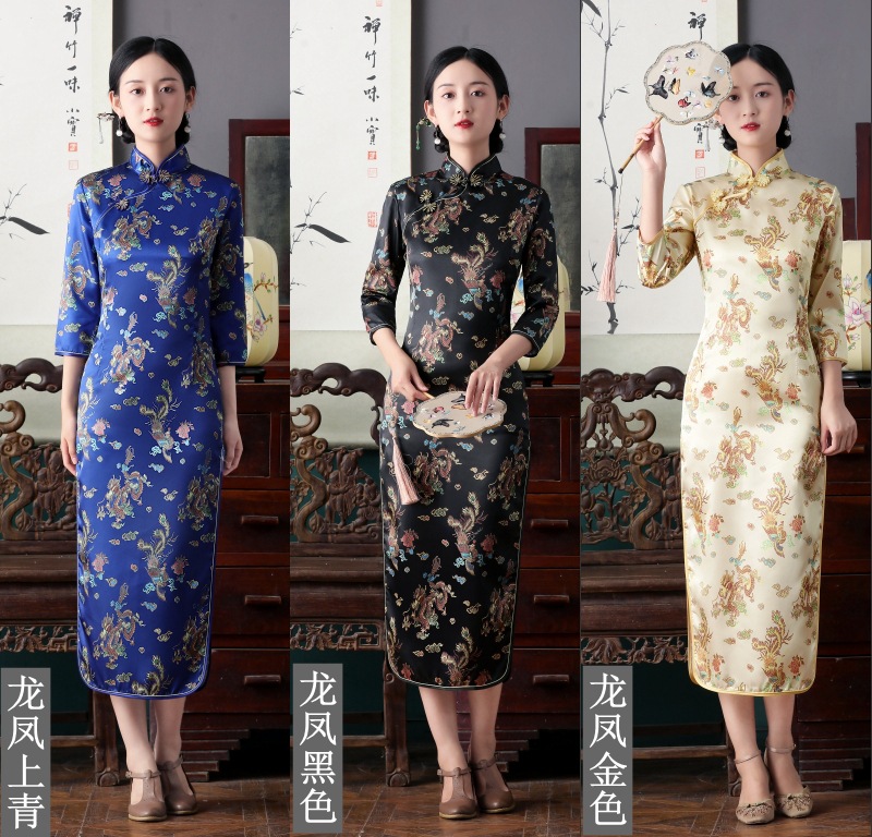 Colors: Bright red three-quarter-sleeve dragon-and-phoenix cheongsam, purplish-red three-quarter-sleeve dragon-and-phoenix cheongsam, lake-blue three-quarter-sleeve dragon-and-phoenix cheongsam, light blue three-quarter-sleeve dragon-and-phoenix cheongsam, black three-quarter-sleeve dragon-and-phoenix cheongsam, gold three-quarter-sleeve dragon-and-phoenix cheongsam, snow-blue three-quarter-sleeve plum-blossom cheongsam, sky-blue three-quarter-sleeve plum-blossom cheongsam, gold three-quarter-sleeve plum-blossom cheongsam, black-and-red striped three-quarter-sleeve plum-blossom cheongsam, light blue three-quarter-sleeve plum-blossom cheongsam, bright red three-quarter-sleeve phoenix-tail cheongsam, bright red three-quarter-sleeve plum-blossom cheongsam, purplish-red three-quarter-sleeve plum-blossom cheongsam