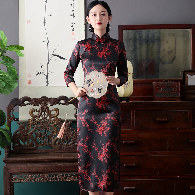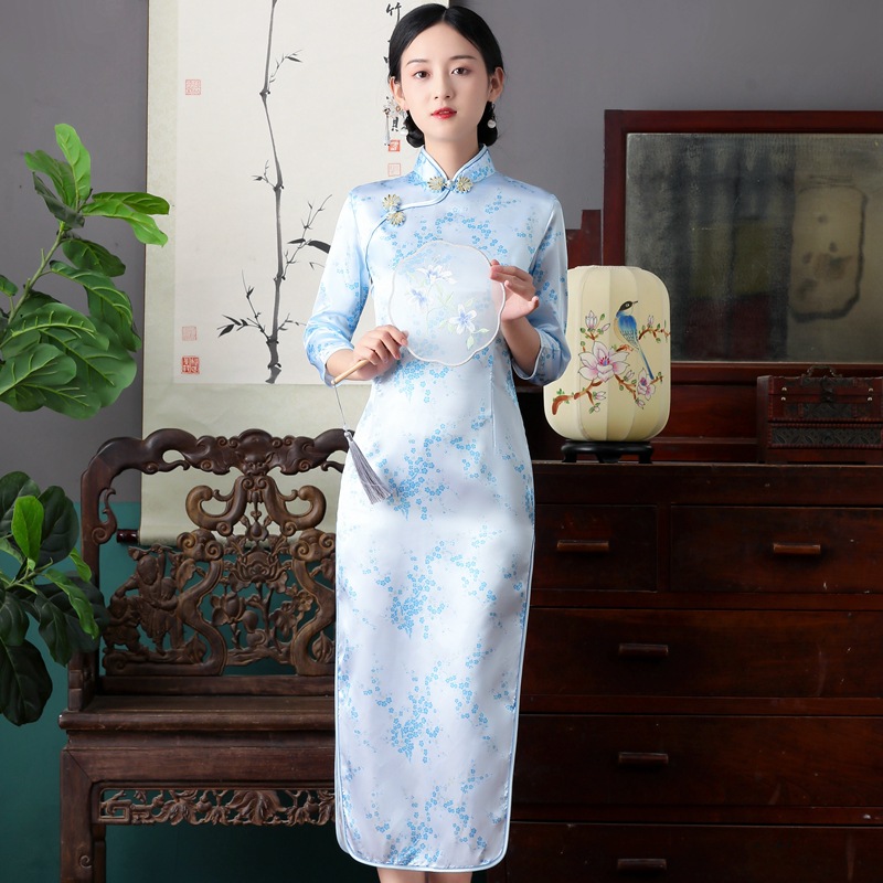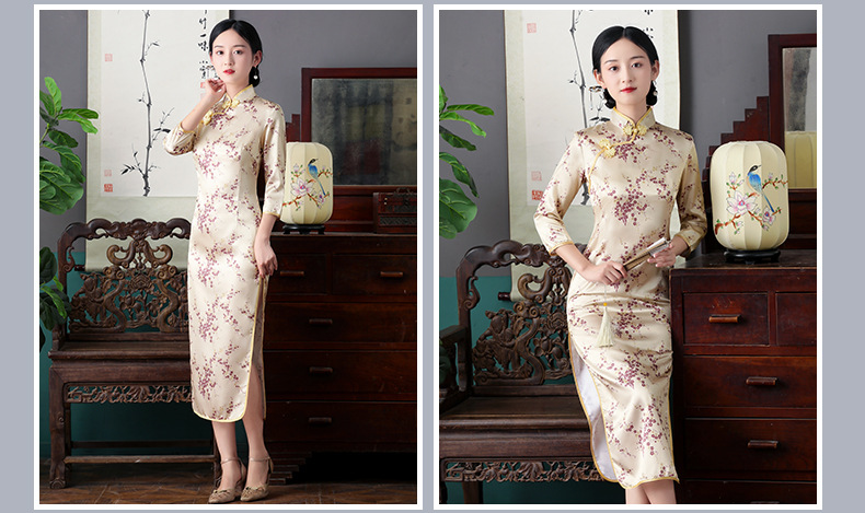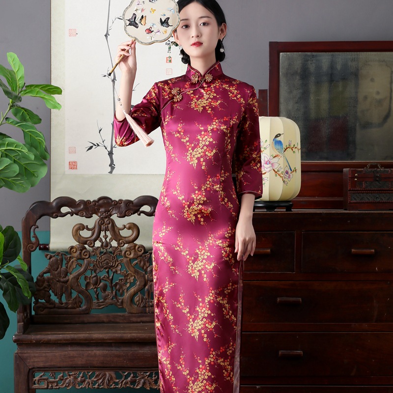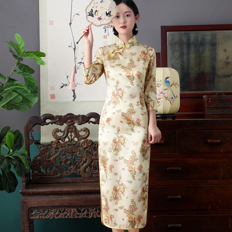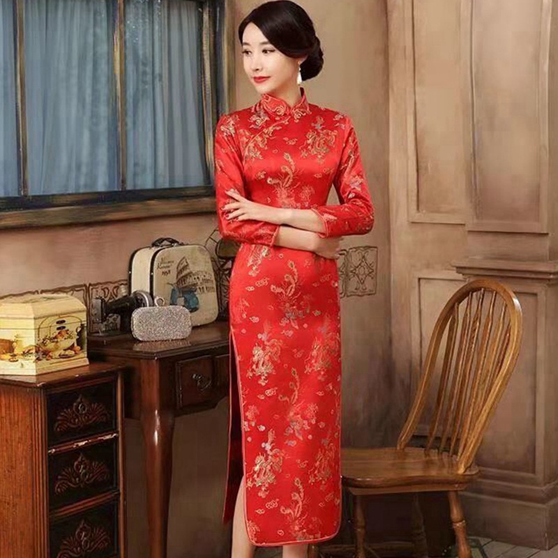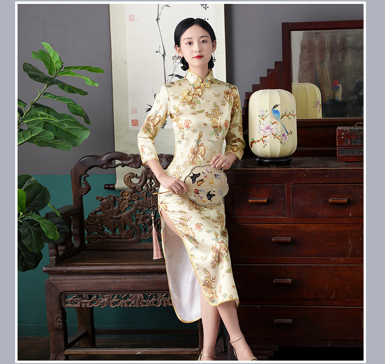 Colors: Bright red three-quarter-sleeve dragon-and-phoenix cheongsam, purplish-red three-quarter-sleeve dragon-and-phoenix cheongsam, lake-blue three-quarter-sleeve dragon-and-phoenix cheongsam, light blue three-quarter-sleeve dragon-and-phoenix cheongsam, black three-quarter-sleeve dragon-and-phoenix cheongsam, gold three-quarter-sleeve dragon-and-phoenix cheongsam, snow-blue three-quarter-sleeve plum-blossom cheongsam, sky-blue three-quarter-sleeve plum-blossom cheongsam, gold three-quarter-sleeve plum-blossom cheongsam, black-and-red striped three-quarter-sleeve plum-blossom cheongsam, light blue three-quarter-sleeve plum-blossom cheongsam, bright red three-quarter-sleeve phoenix-tail cheongsam, bright red three-quarter-sleeve plum-blossom cheongsam, purplish-red three-quarter-sleeve plum-blossom cheongsam