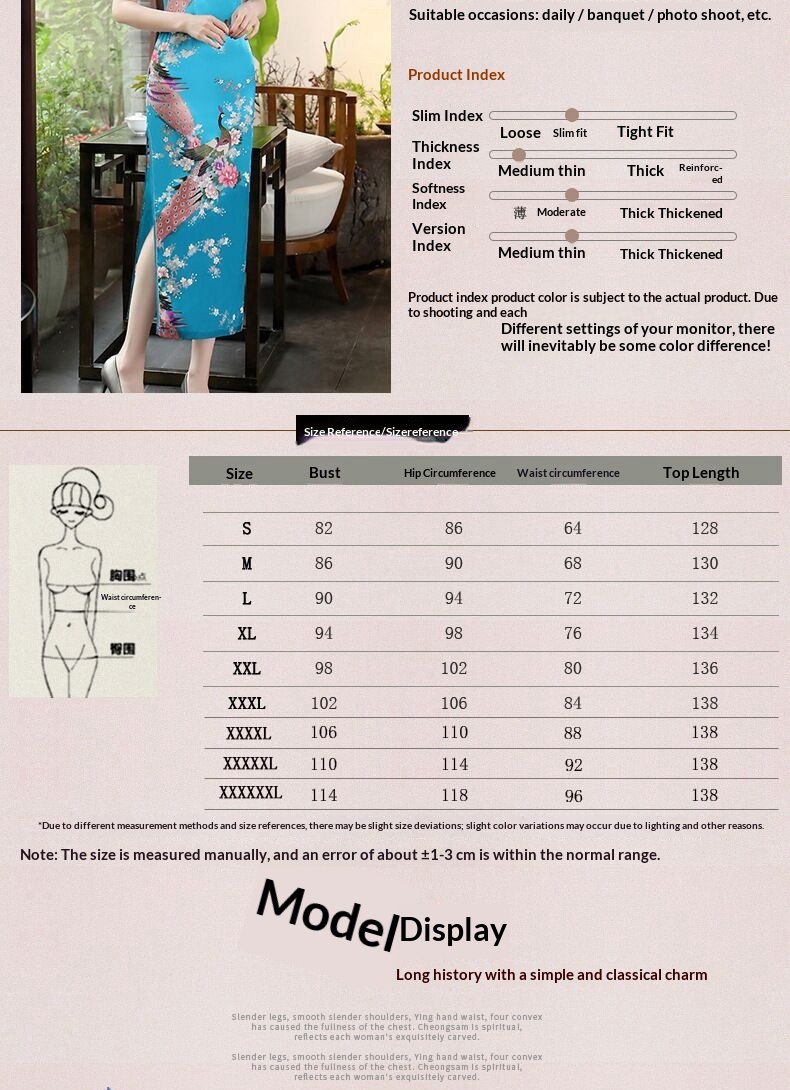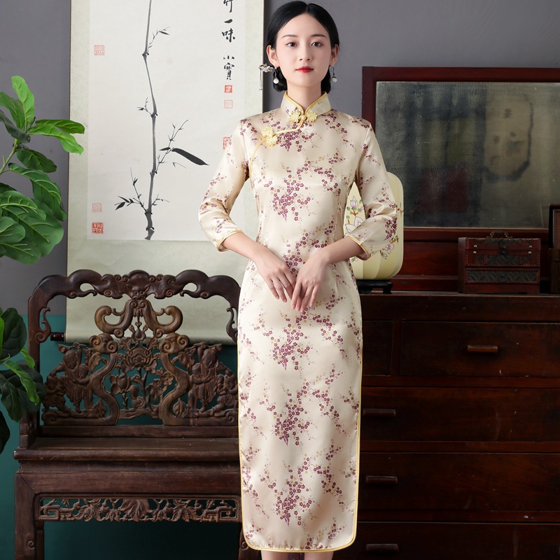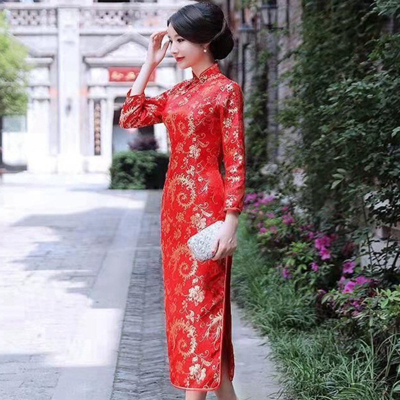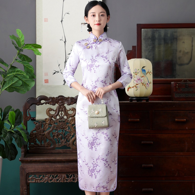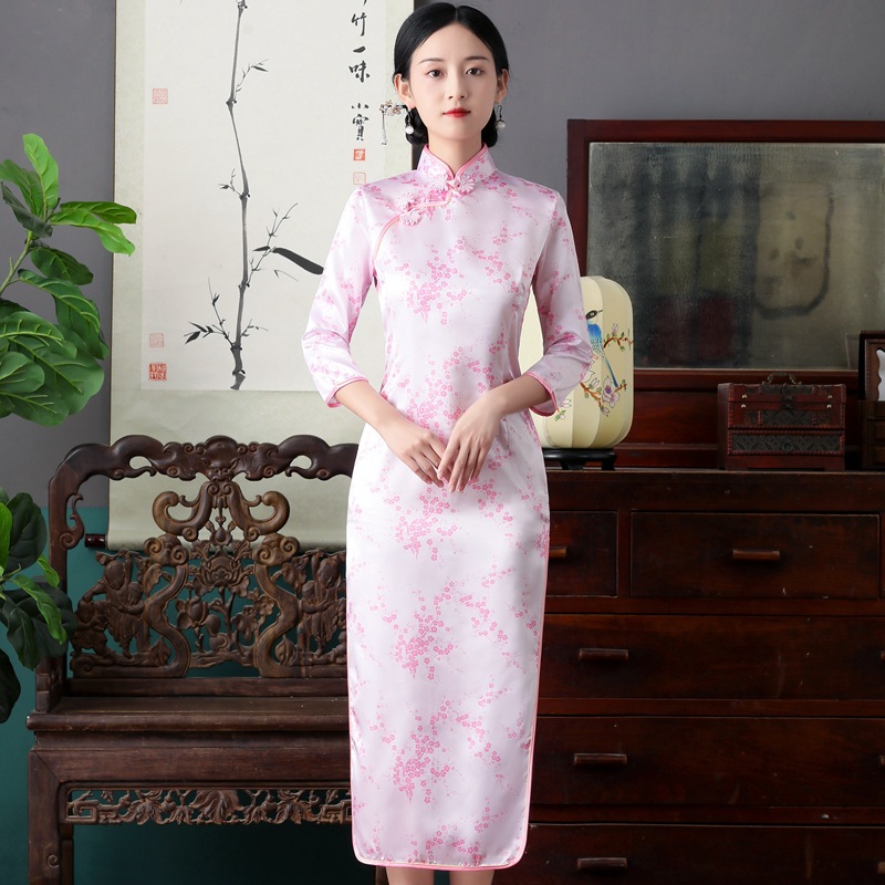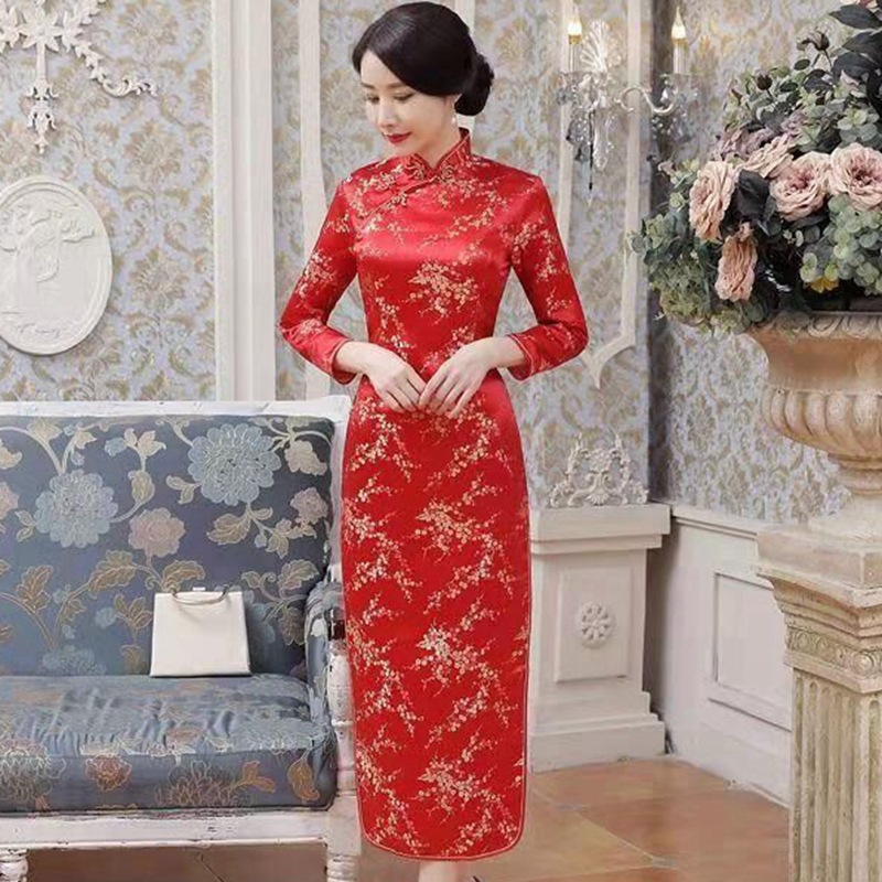 Colors: Bright red three-quarter-sleeve dragon-and-phoenix cheongsam, purplish-red three-quarter-sleeve dragon-and-phoenix cheongsam, lake-blue three-quarter-sleeve dragon-and-phoenix cheongsam, light blue three-quarter-sleeve dragon-and-phoenix cheongsam, black three-quarter-sleeve dragon-and-phoenix cheongsam, gold three-quarter-sleeve dragon-and-phoenix cheongsam, snow-blue three-quarter-sleeve plum-blossom cheongsam, sky-blue three-quarter-sleeve plum-blossom cheongsam, gold three-quarter-sleeve plum-blossom cheongsam, black-and-red striped three-quarter-sleeve plum-blossom cheongsam, light blue three-quarter-sleeve plum-blossom cheongsam, bright red three-quarter-sleeve phoenix-tail cheongsam, bright red three-quarter-sleeve plum-blossom cheongsam, purplish-red three-quarter-sleeve plum-blossom cheongsam