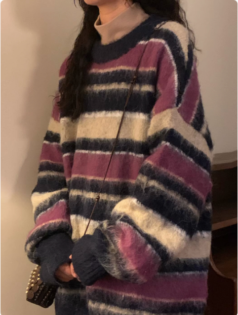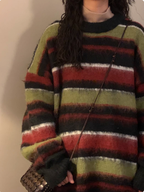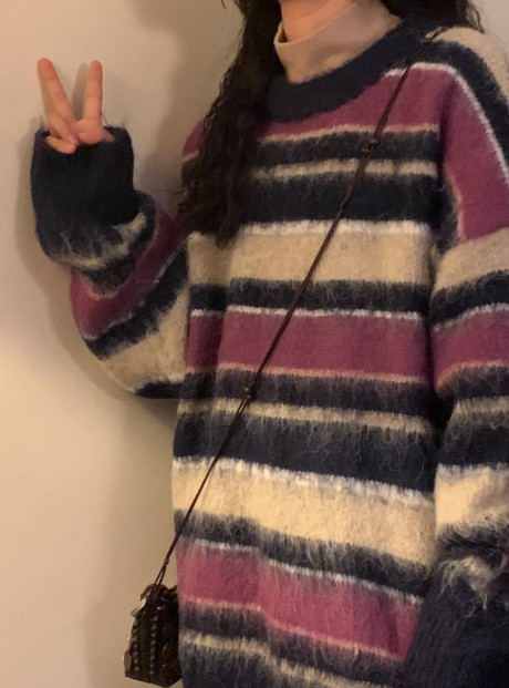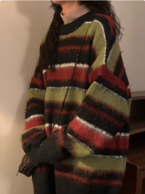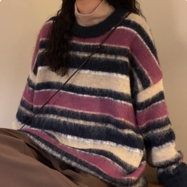 Retro Loose Contrast Color Striped Idle Style Round Neck Sweater