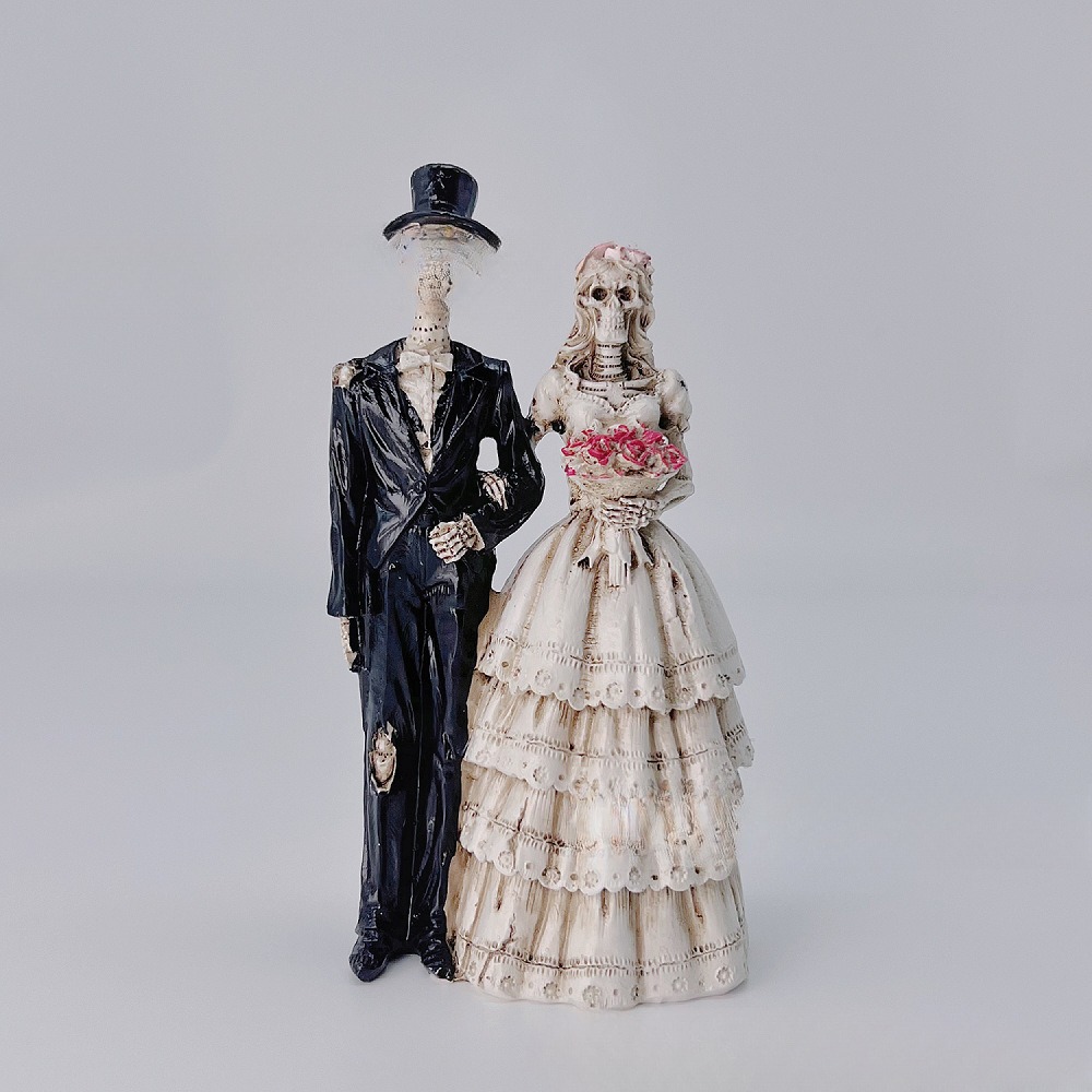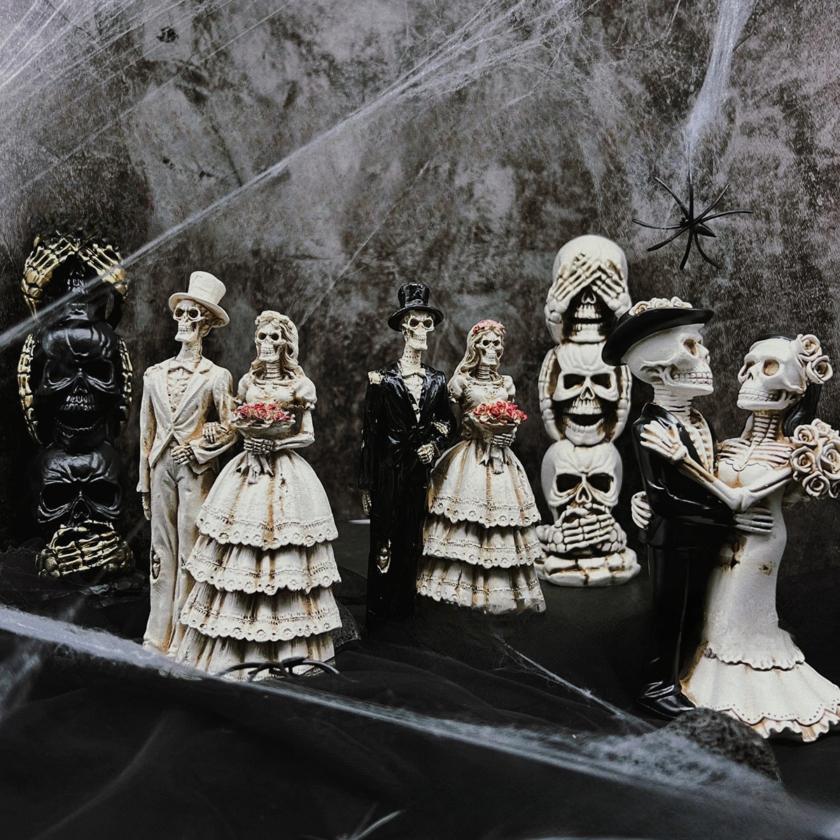 Color: Black suit ghost bride, white suit holding red flower ghost bride, standing skeleton bride, sitting skeleton bride, see no evil hear no evil speak no evil (black), see no evil hear no evil speak no evil (white)