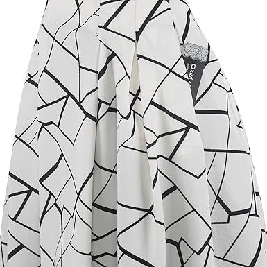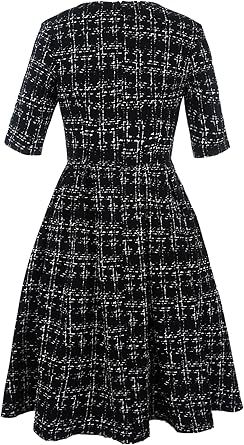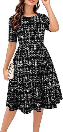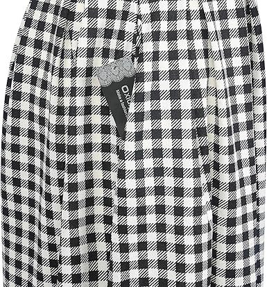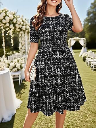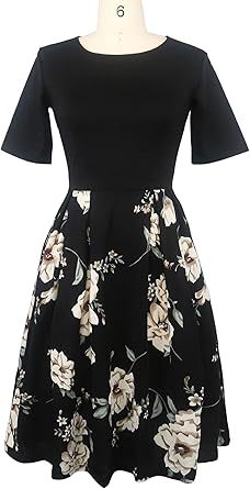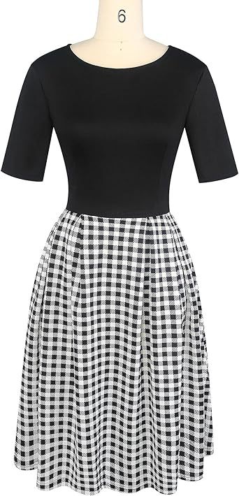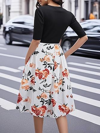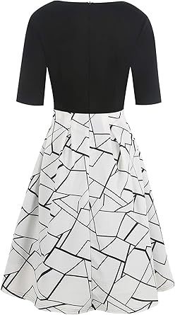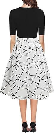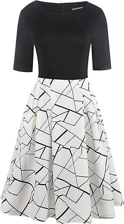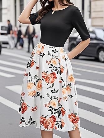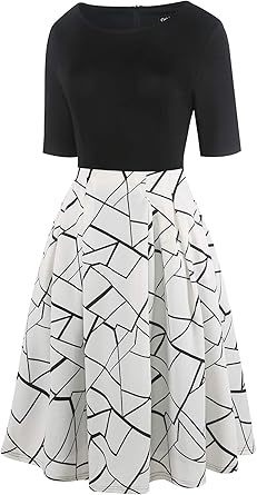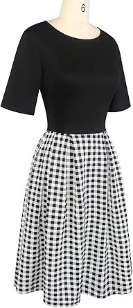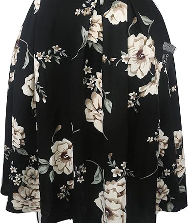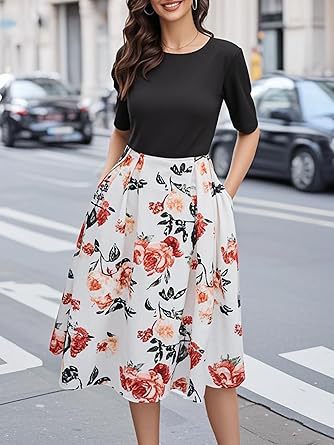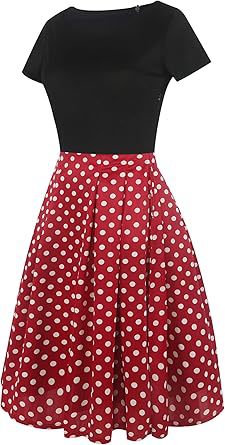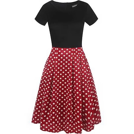 Colors: Black top with black base and white small-floral-print skirt; black top with red base and white polka-dot skirt; black top with black-and-white striped skirt; black top with white base and small-floral-print skirt; black top with black-and-white plaid skirt.