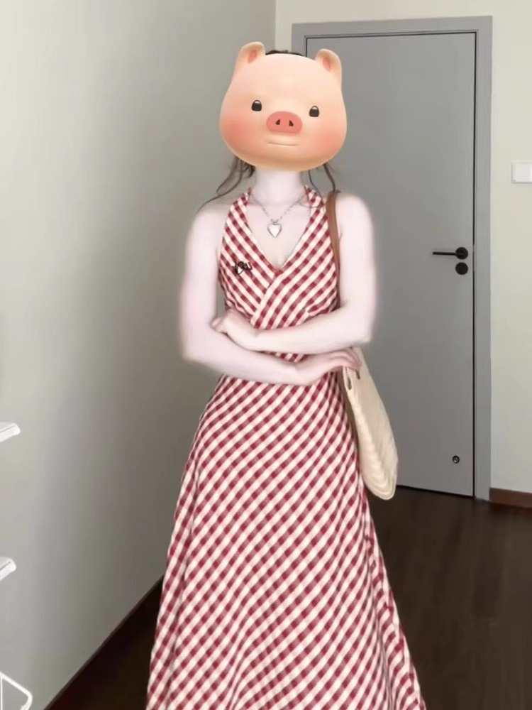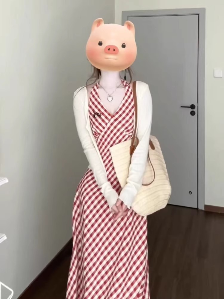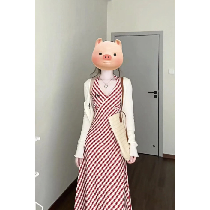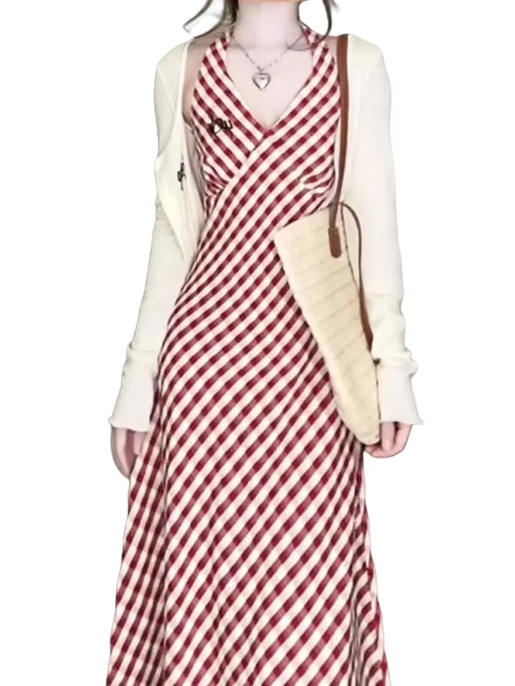 Color: Cardigan red check overall dress