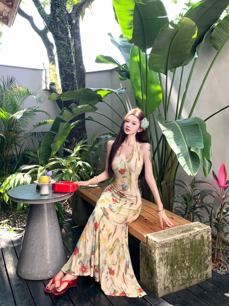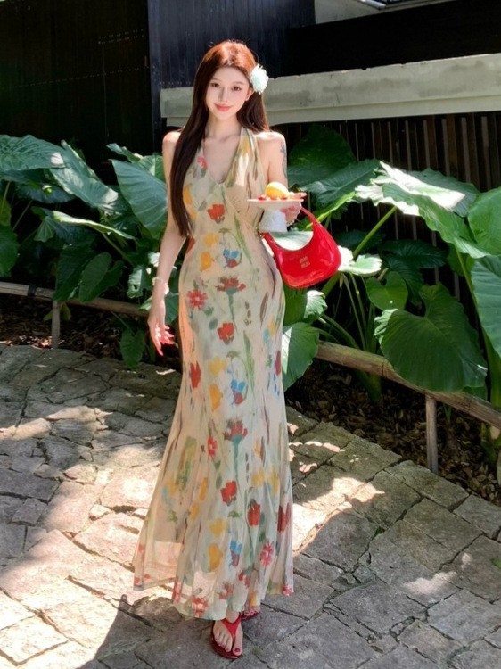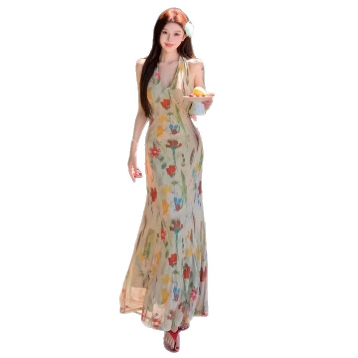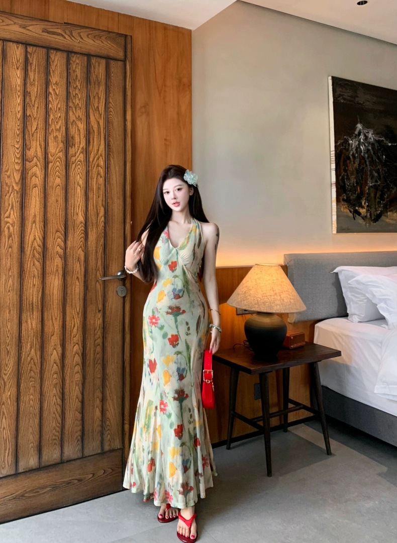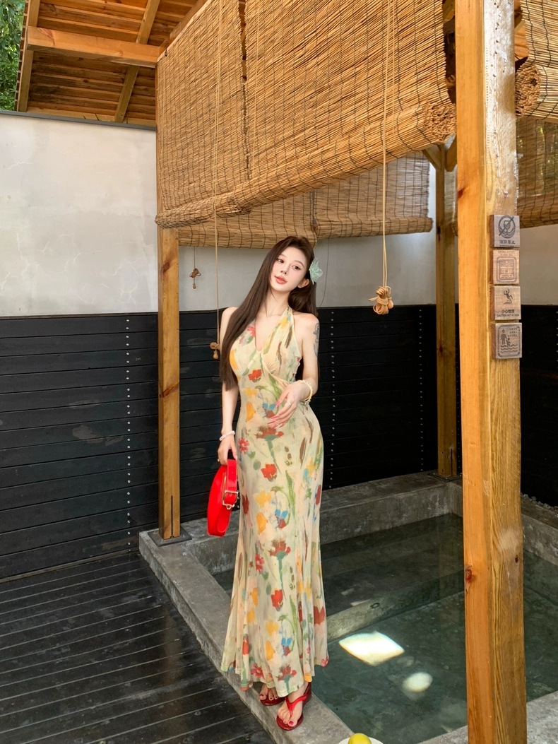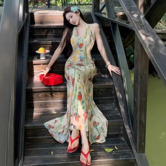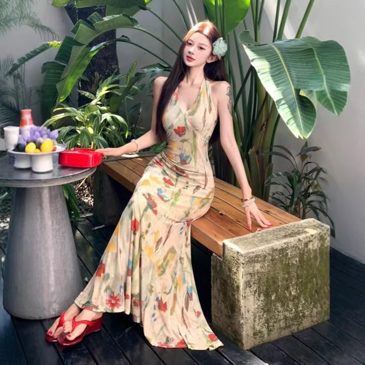 Retro Print Backless V-Neck Halter Dress
