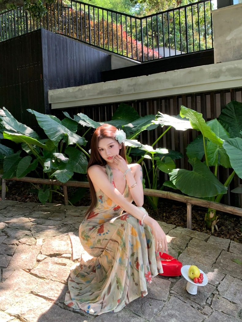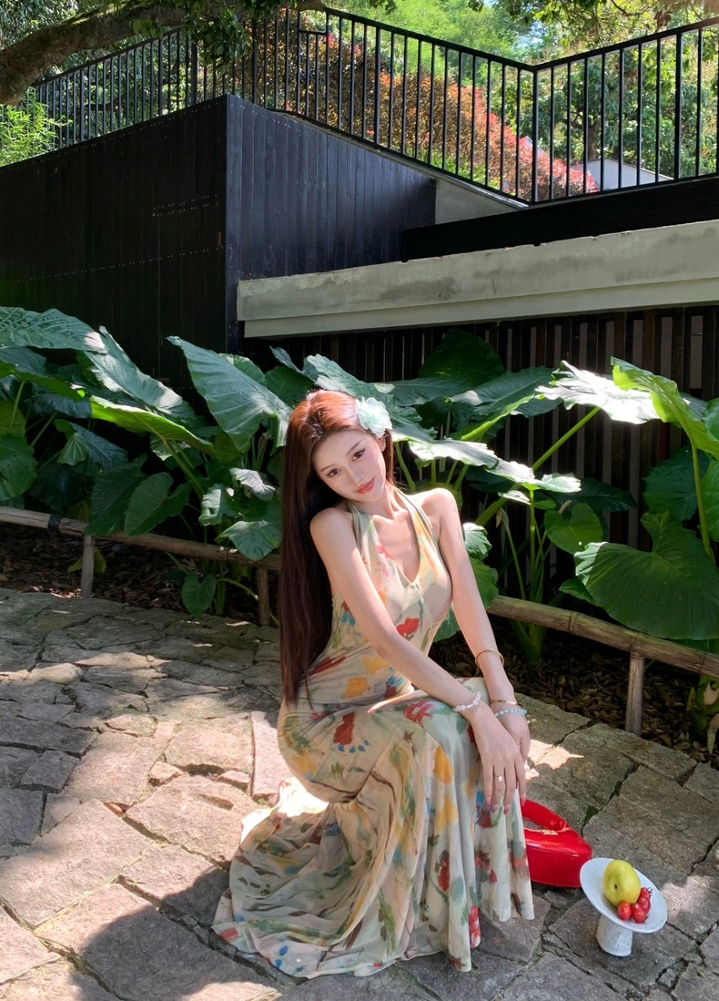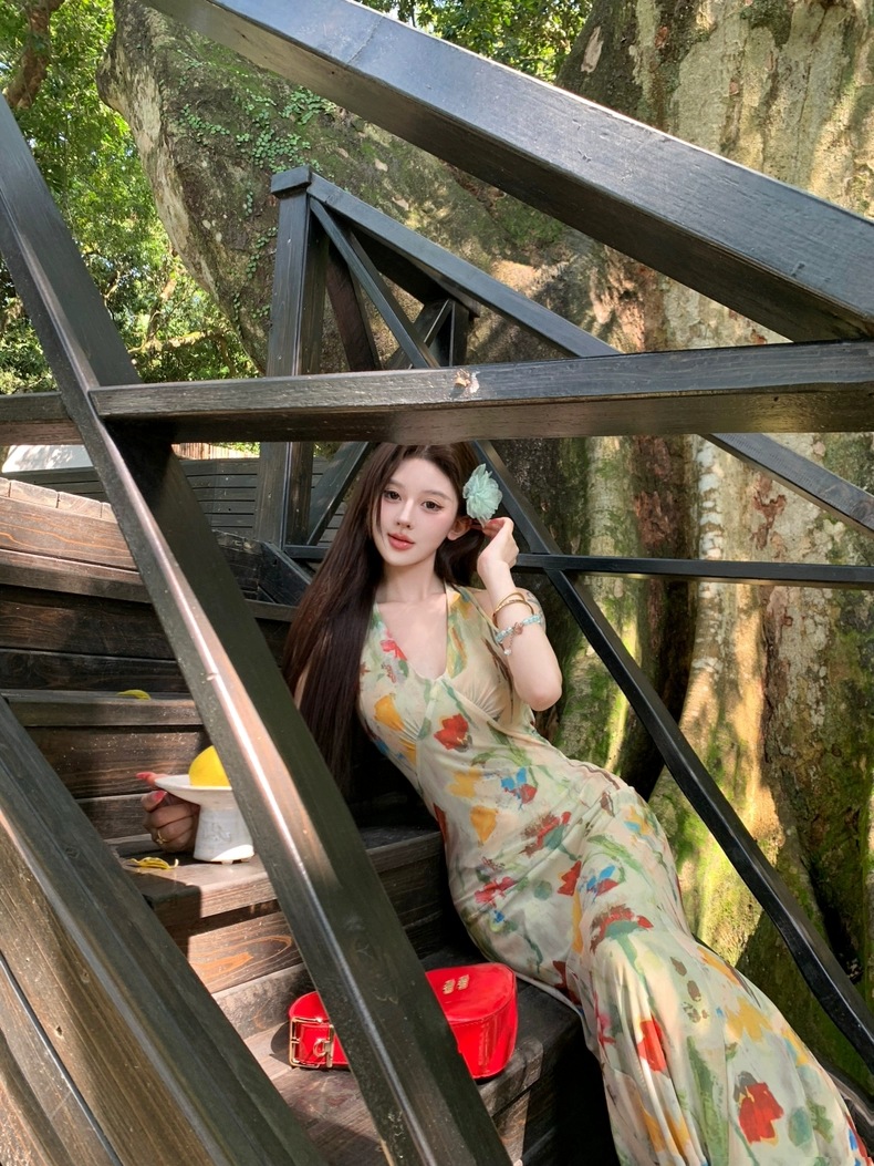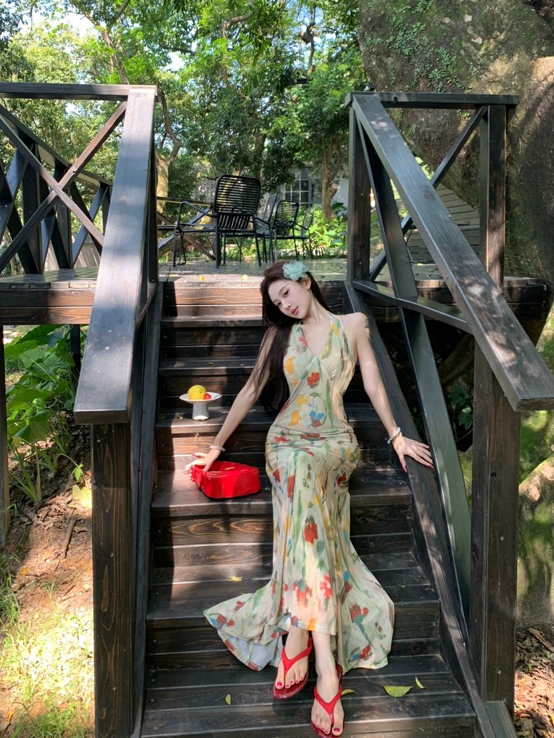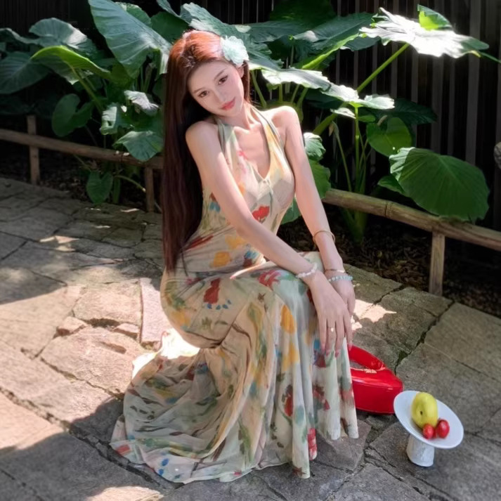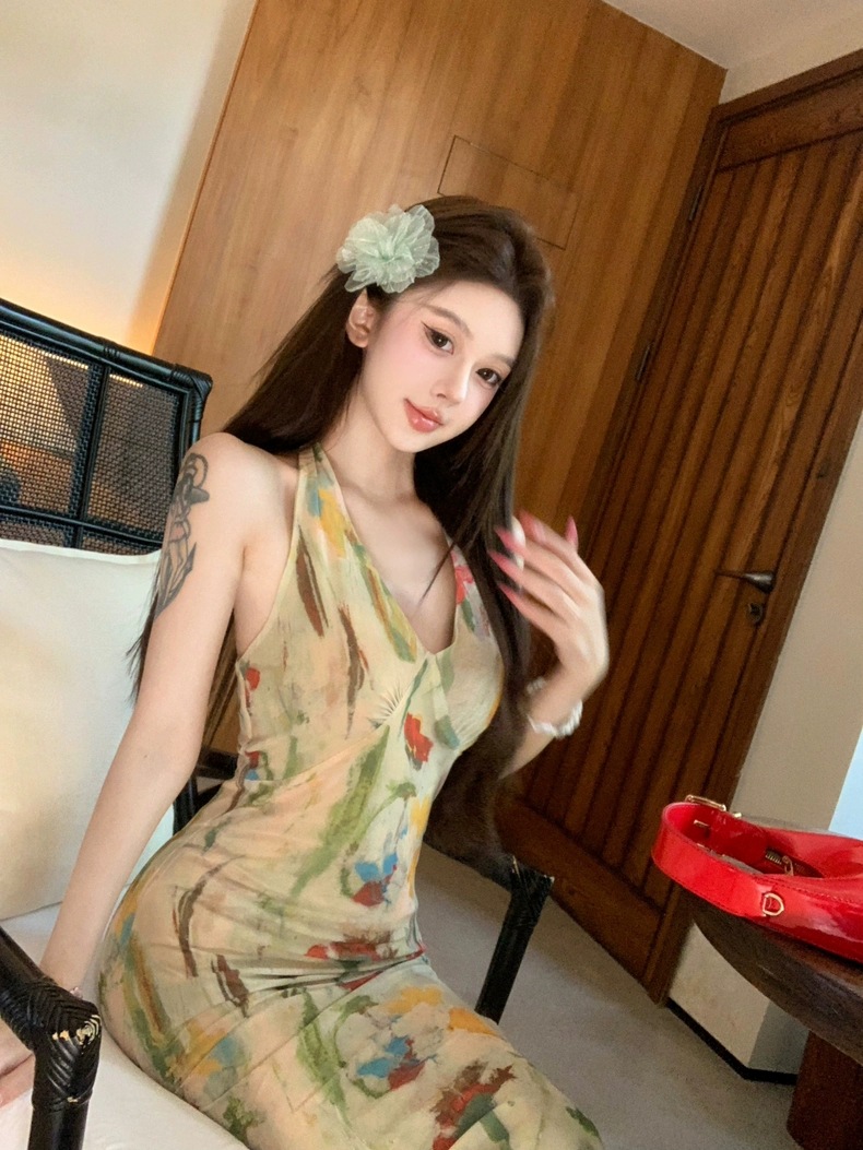 Retro Print Backless V-Neck Halter Dress