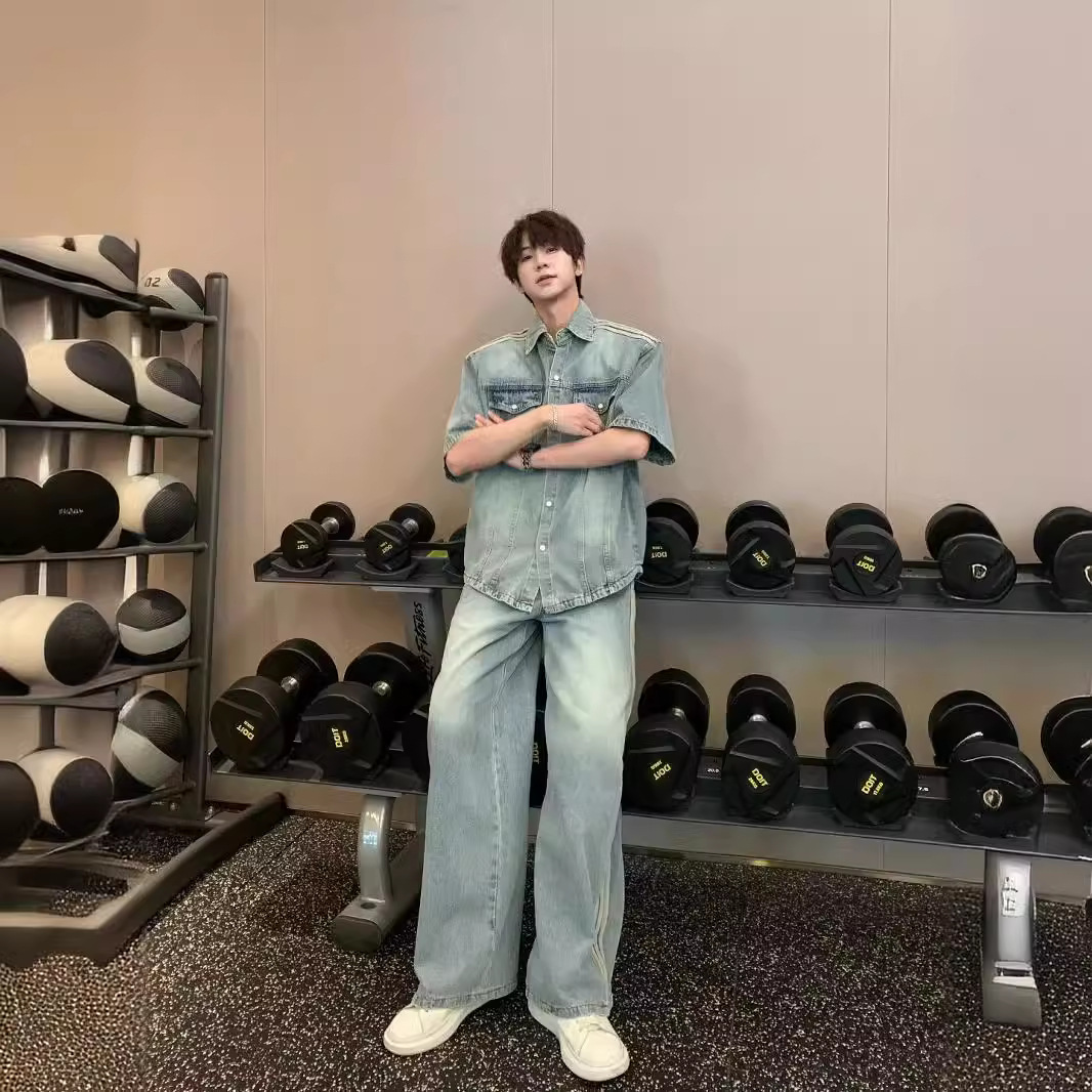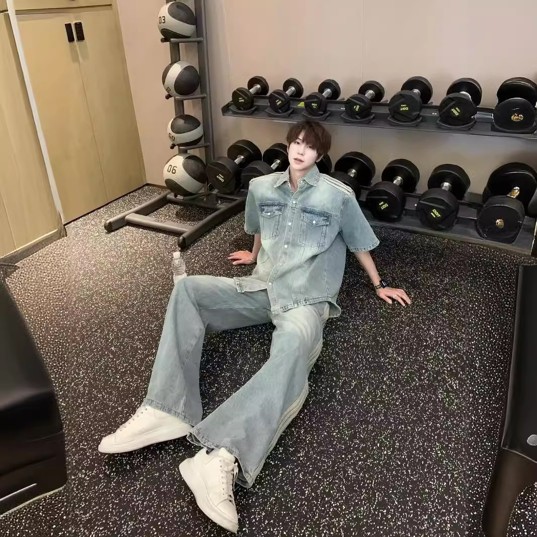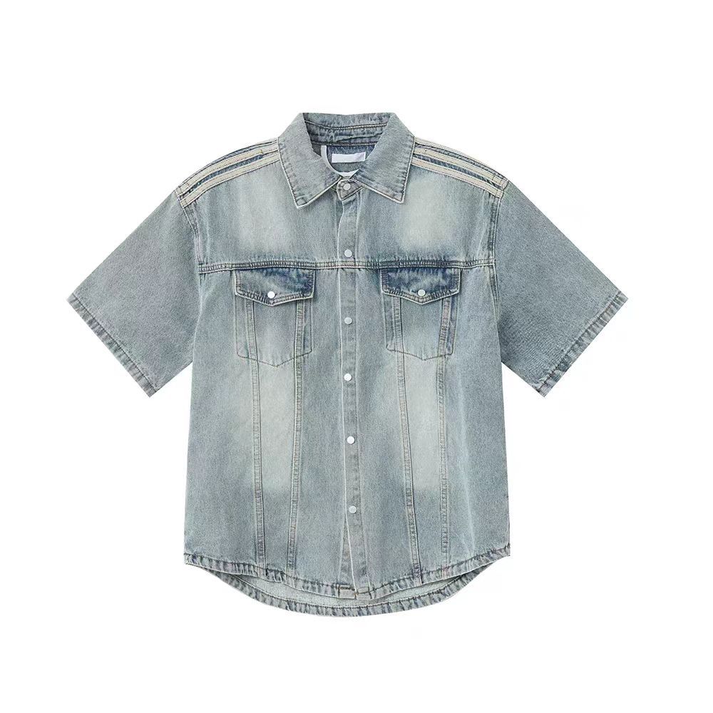 Retro Side Three Bar Stripes Short Sleeve Denim Shirt Outfit Men