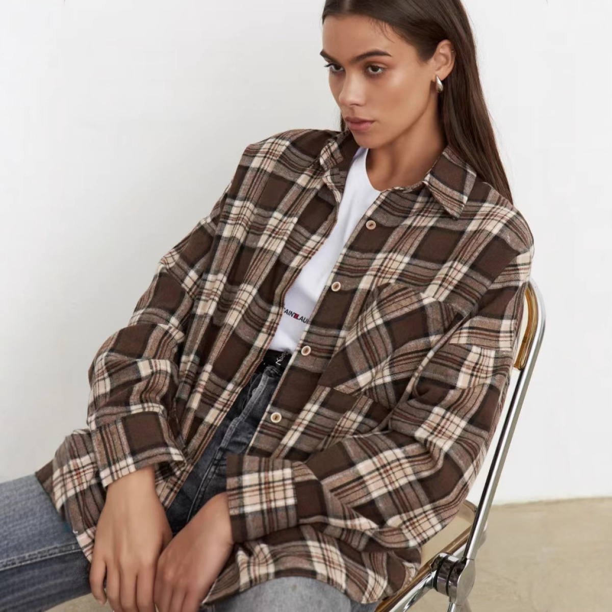 Retro Style All-match Plaid Lapel Long Sleeve Shirt