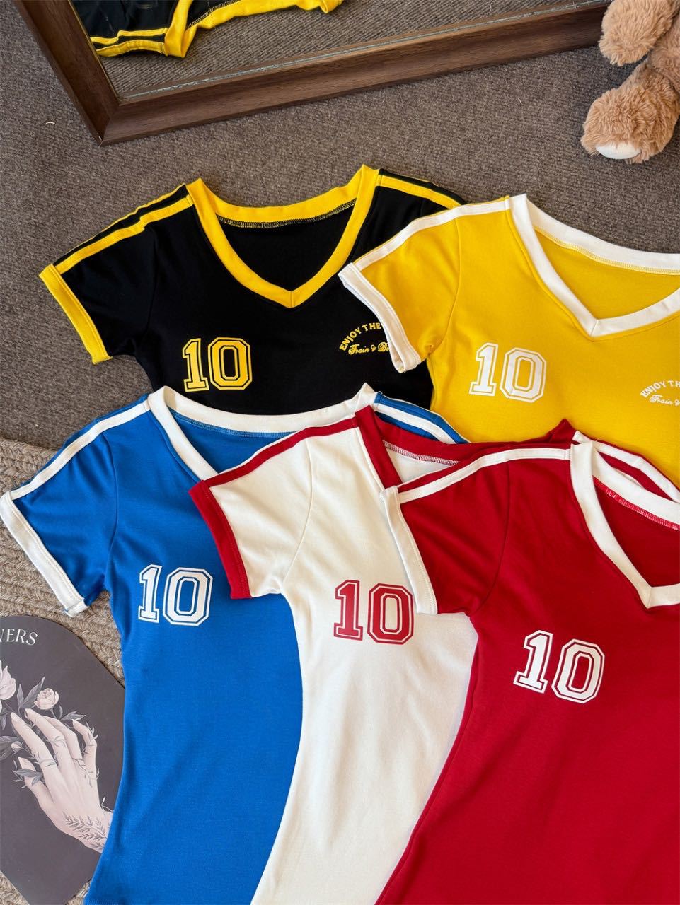 Colors: Black, white, red, yellow, blue