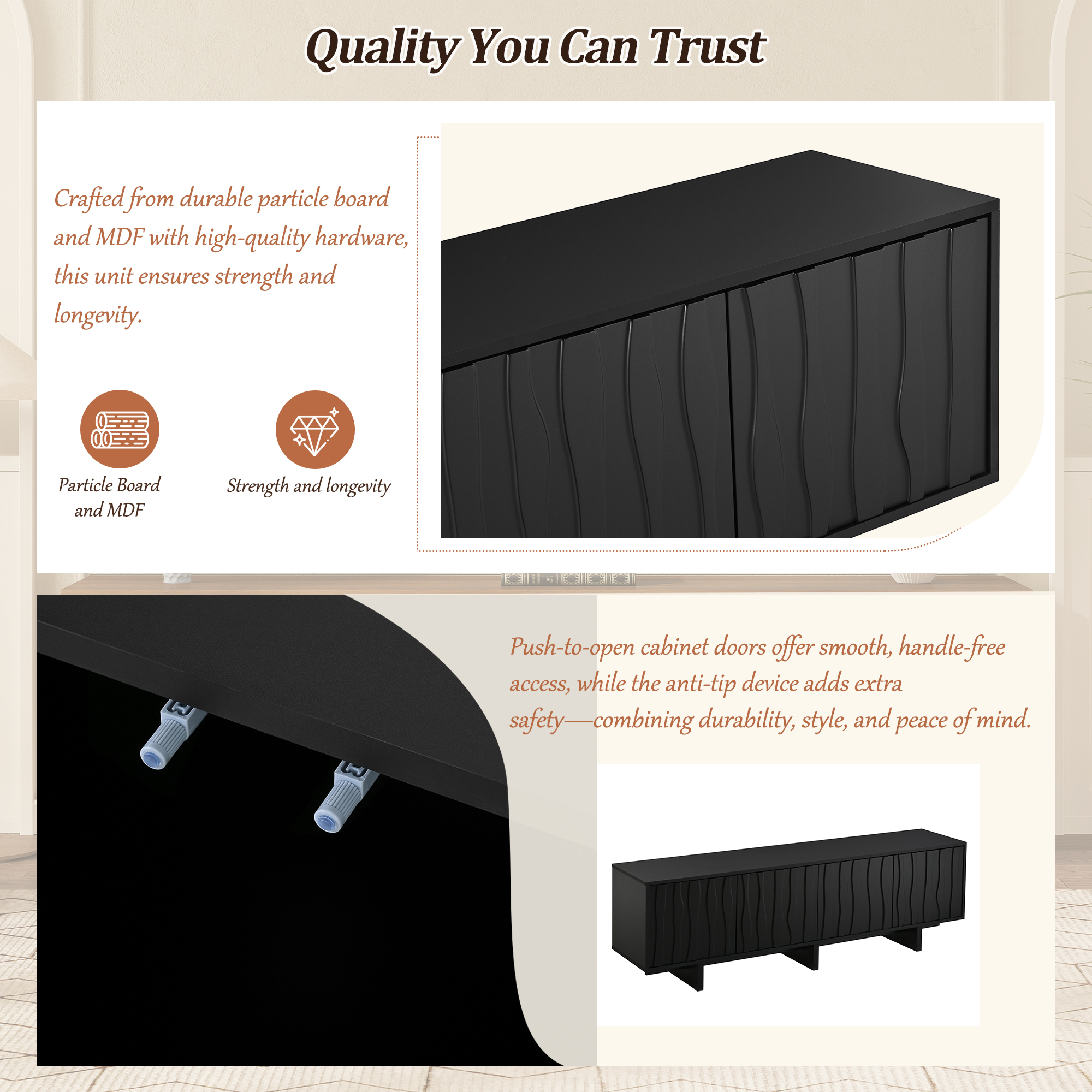 Crafted from durable particle board and MDF with high-quality hardware, this unit ensures strength and longevity. Push-to-open cabinet doors offer smooth, handle-free access, while the anti-tip device adds extra safety—combining durability, style, and peace of mind.
