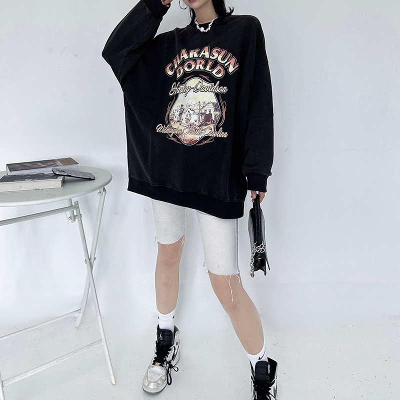 Clothing style details: printed stitching, thread tie-dyed and worn