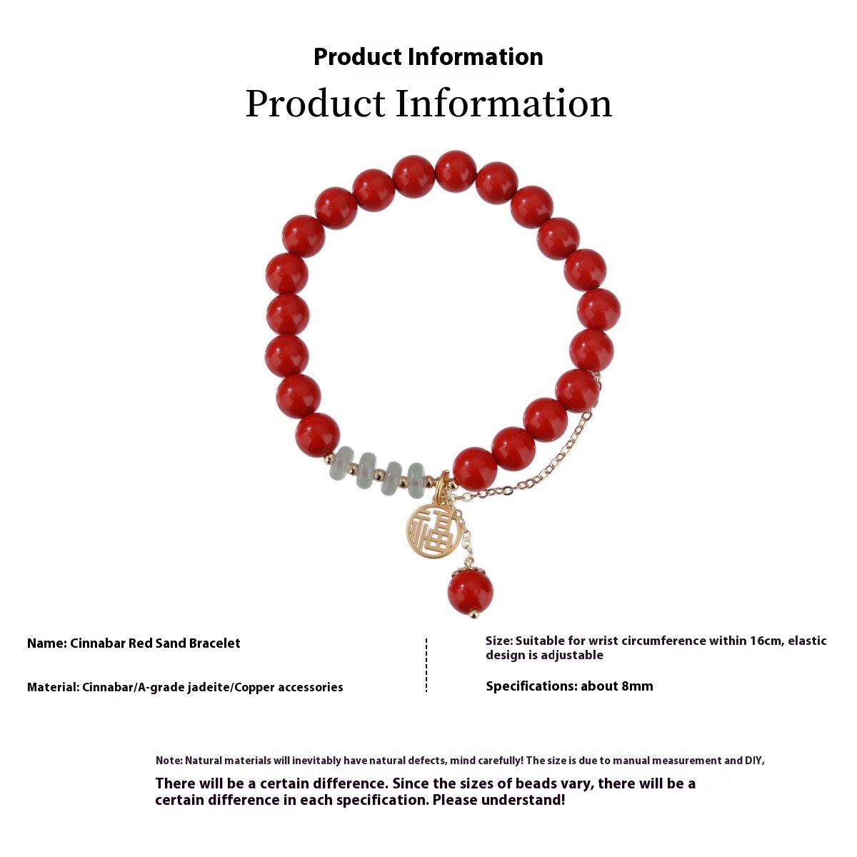 Color: red sand cinnabar bracelet fu character A- grade jade Tassel Style about 8mm