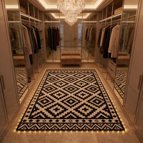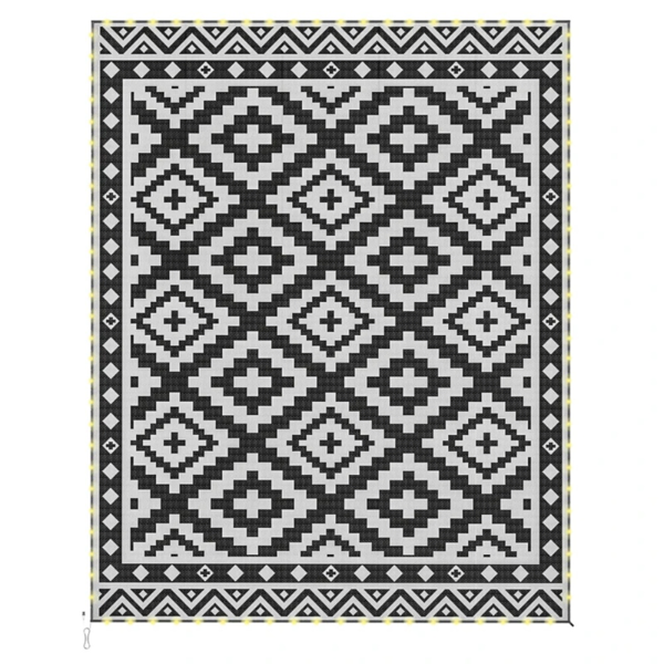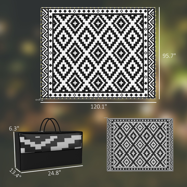 Features: - Includes a 37.5' LED string for a unique, warm ambiance - Reversible design with a classic pattern offers two looks in a single product - Made from strong, waterproof and UV-resistant PP material for outdoor use - Features corner loops and four stakes to secure the outdoor rug - This 120.1" x 95.7" rug easily folds into the included carrying bag - Suitable for your yard, patio, camping trips and RV adventures - No assembly required Specification: - Colors: Black, White - Materials: PP, Non-woven fabric, Plastic - Dimensions: 120.1" L x 95.7" W x 0.1" D - Carry Bag Dimensions: 24.8" L x 13.4" W x 6.3" H