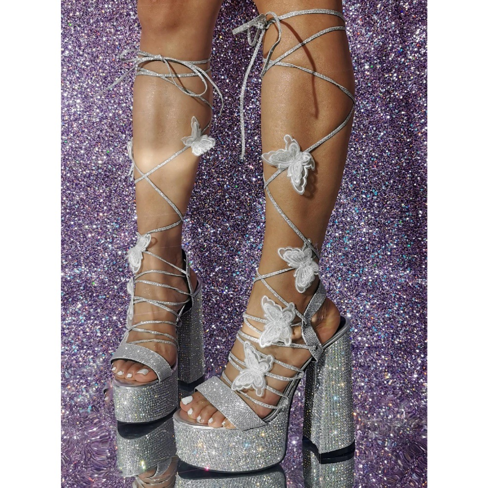 Rhinestone Butterfly Strap Water Platform Chunky Heel High Heel Sandals