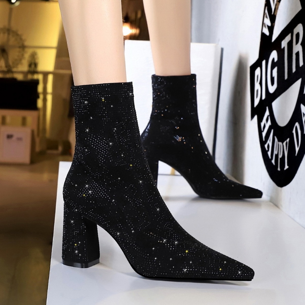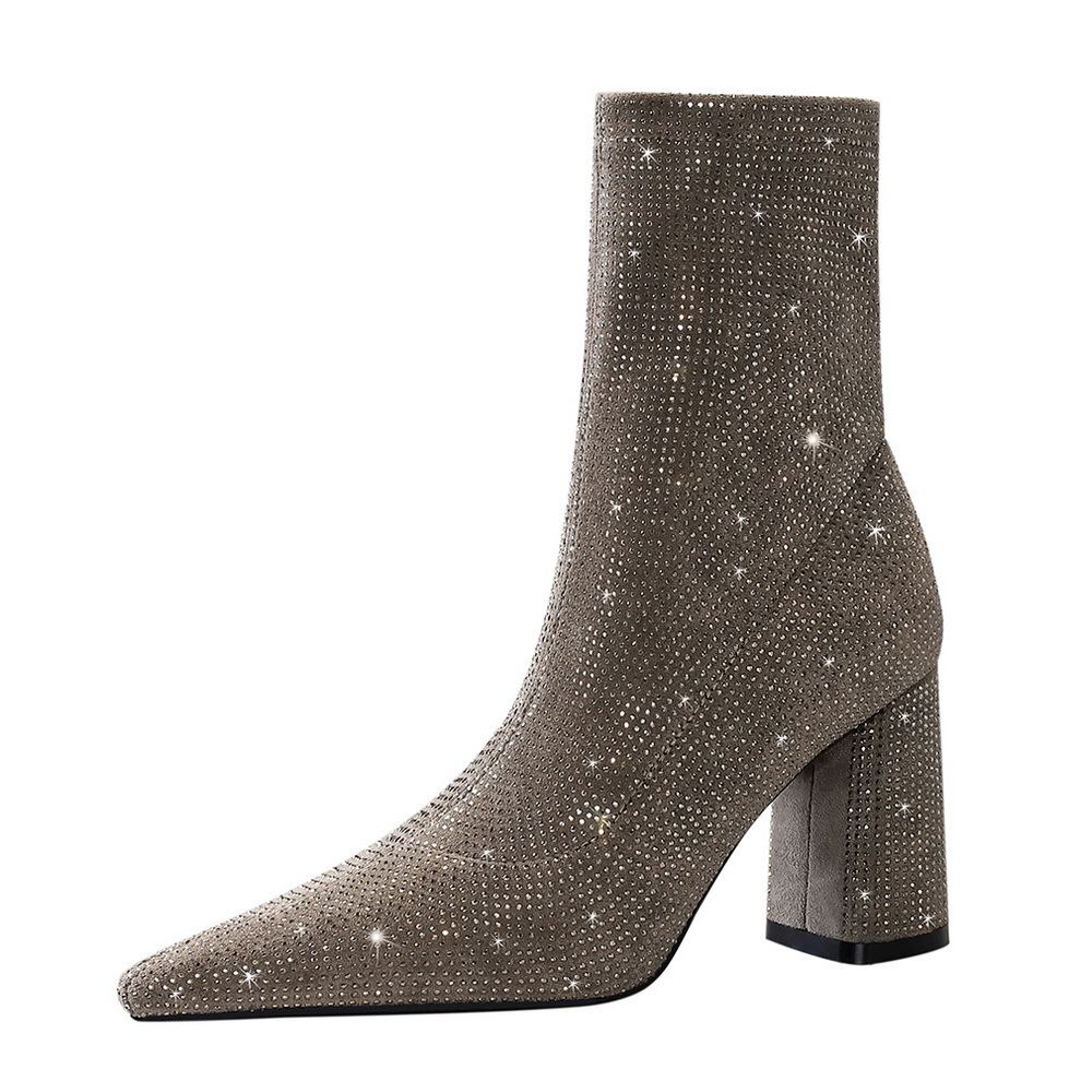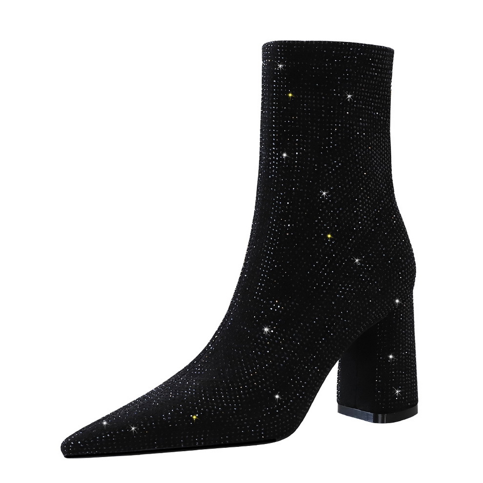 Rhinestone High Heels Women's Thick Heel Boots With Pointed Toe