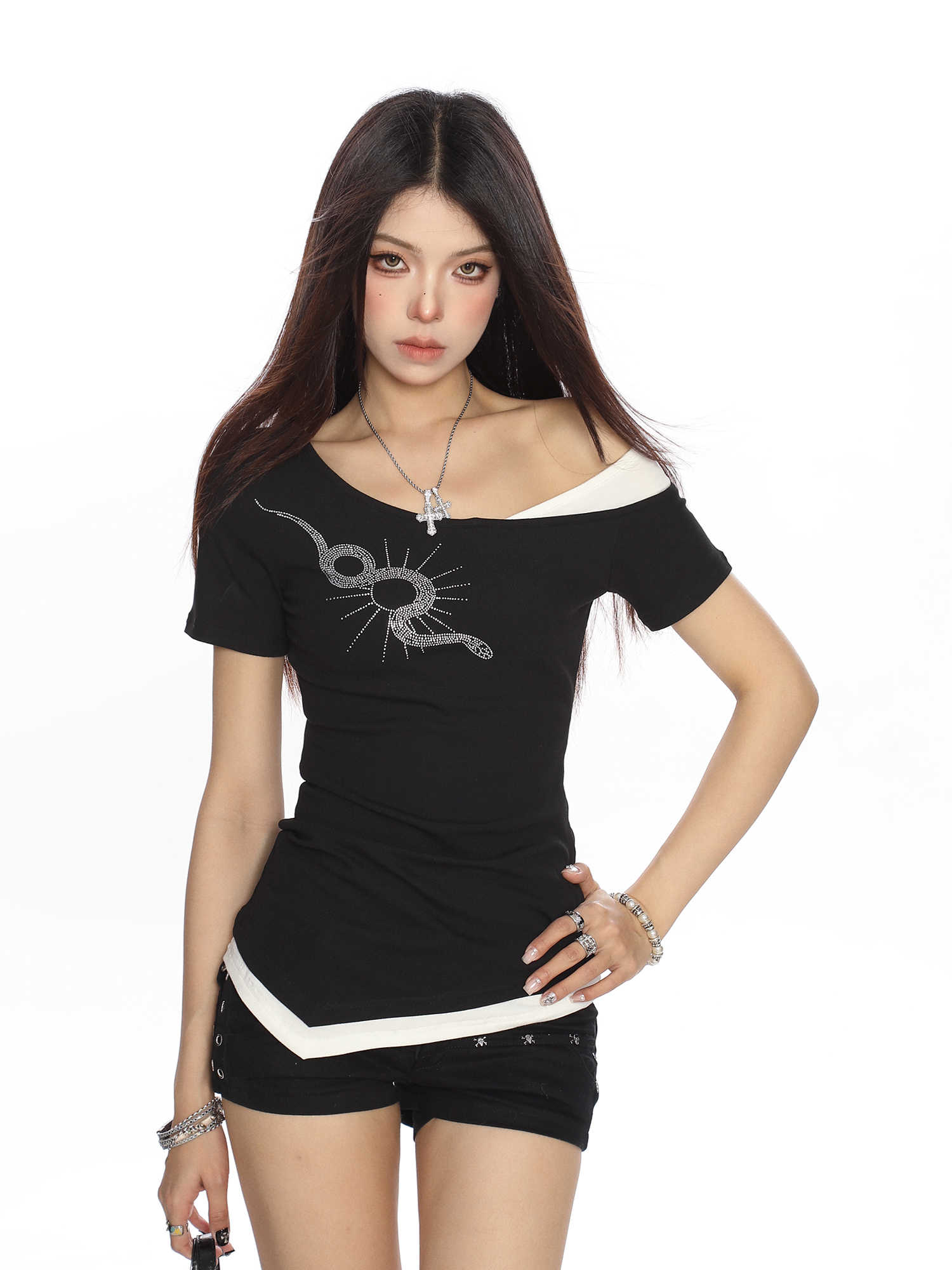 Rhinestone Snake Fake Two-piece Shoulder Short-sleeved T-shirt