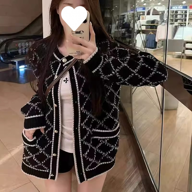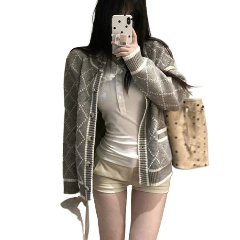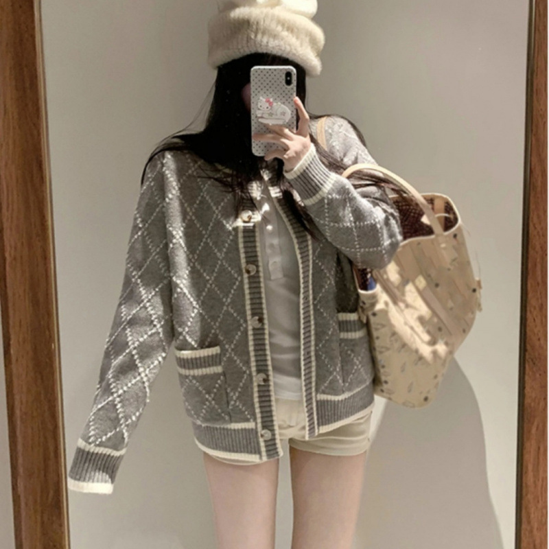 Rhombus Sweater Coat Women's Mid-length Gray Knitted Cardigan