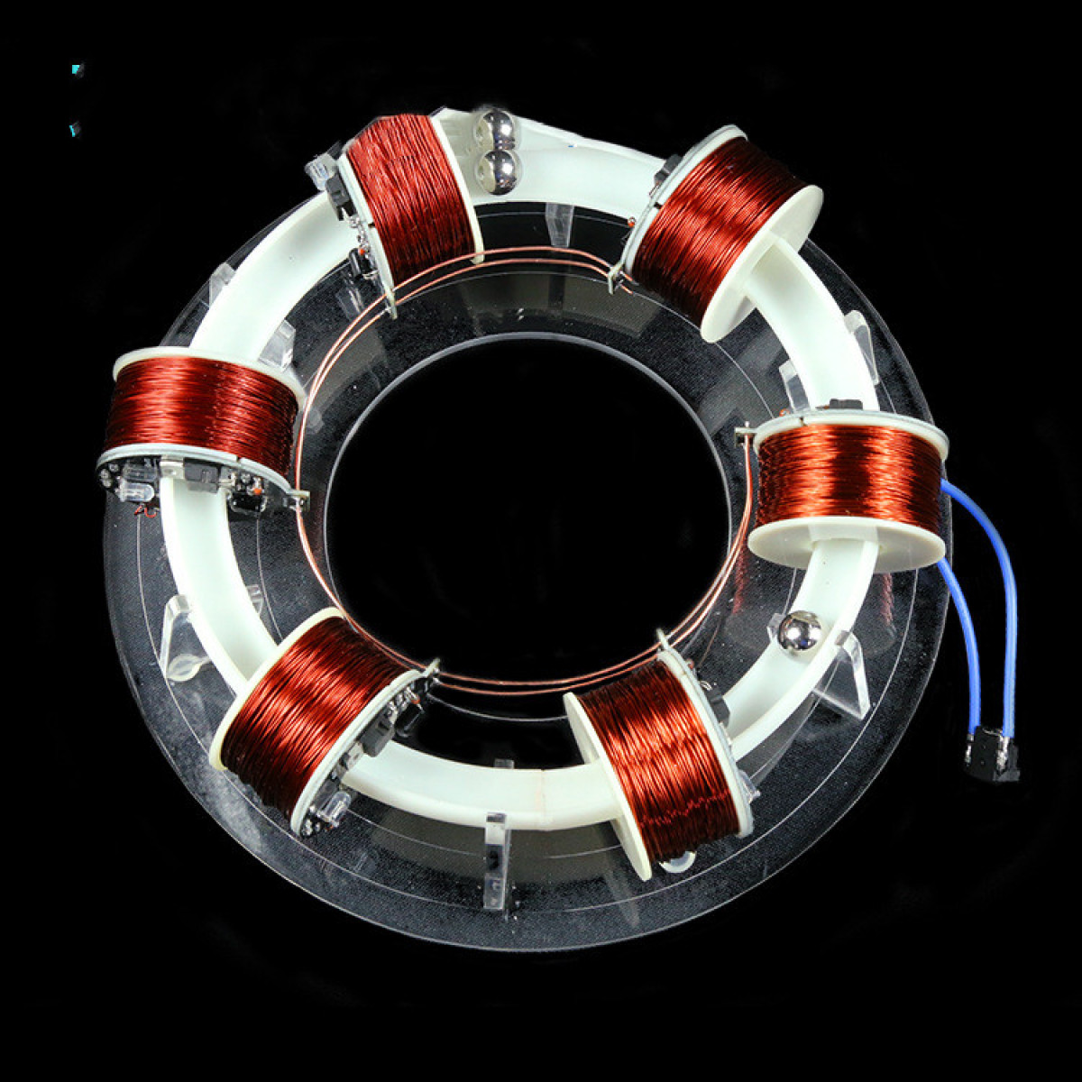Main components: oxygen free copper coil, 940mm infrared pair tube, 15mm high magnetic steel ball, 23cm circular track, transparent acrylic structure