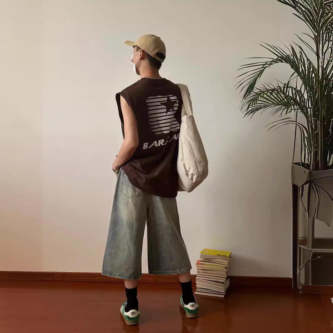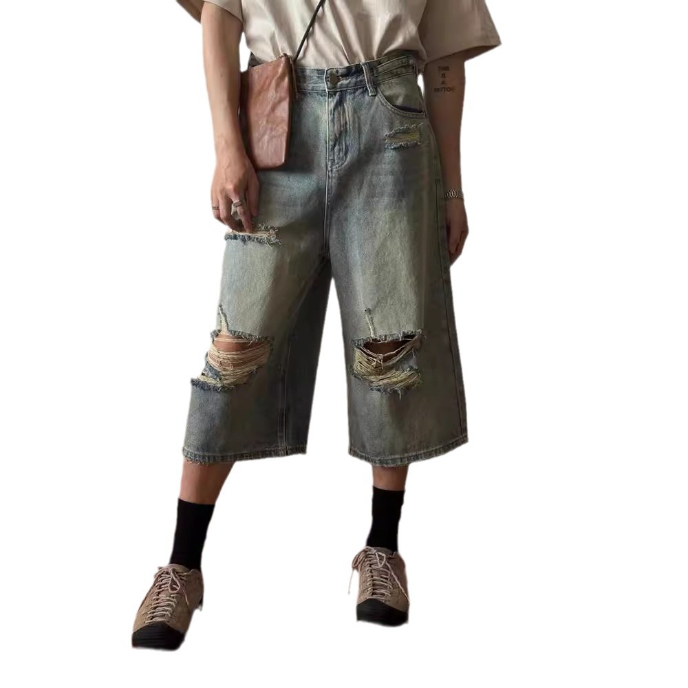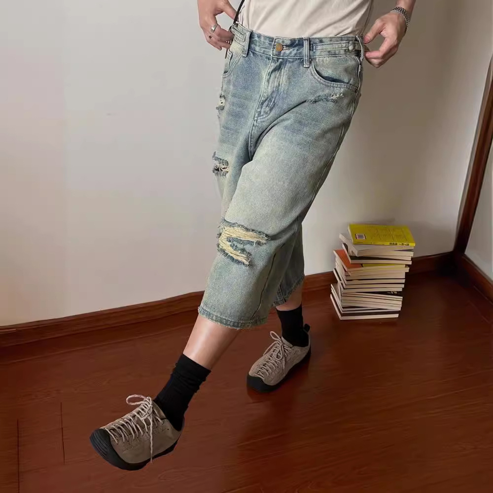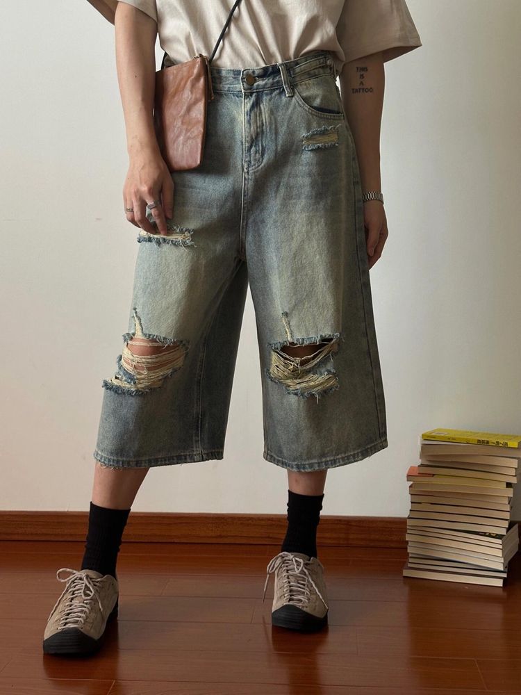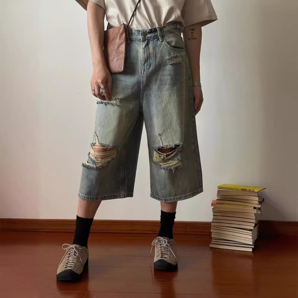 Ripped Wide-legged Jeans Loose Retro Washed Straight Short Pants