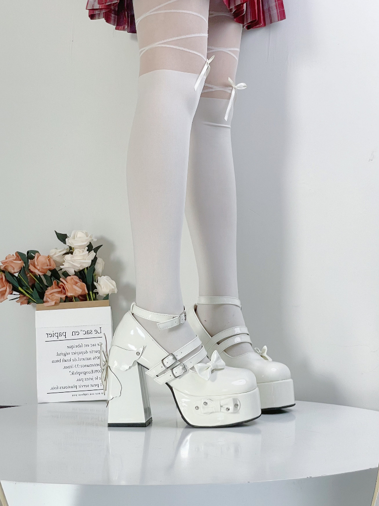 Rivet Bow Round Toe Bright Leather Platform Thick High Heels