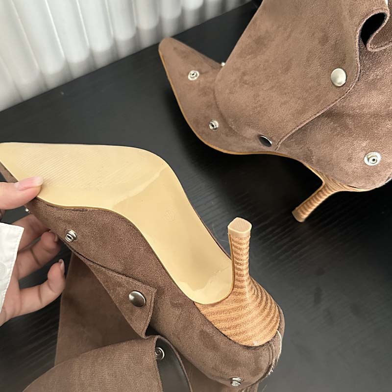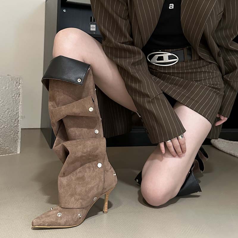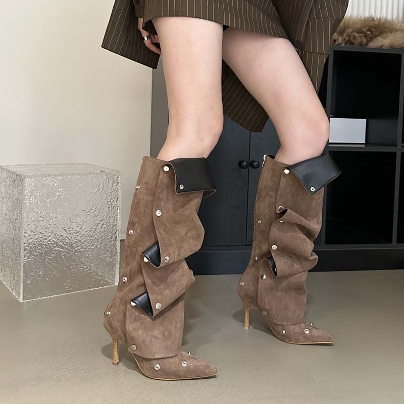 Rivet Buckle Stitching Two-way Stiletto Heel Denim Pleated Pile Style Boots